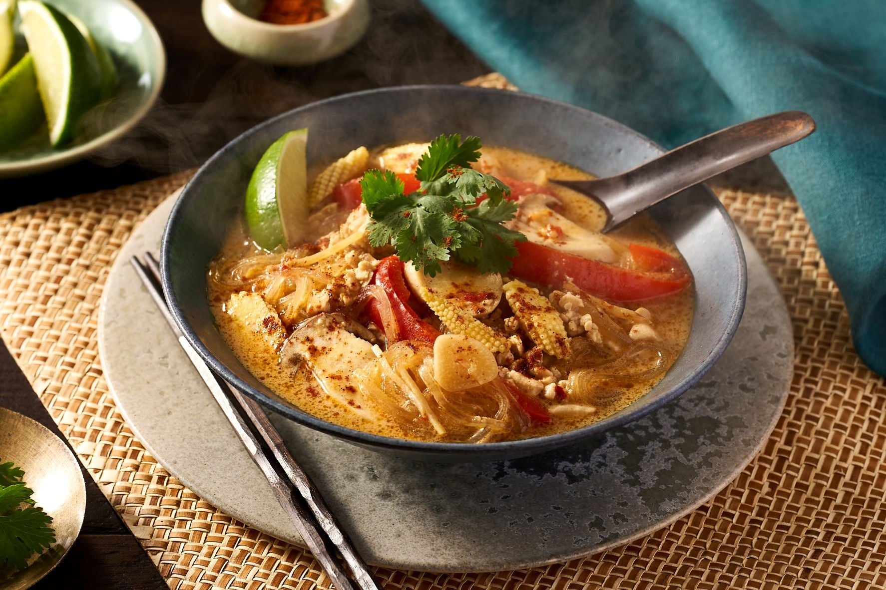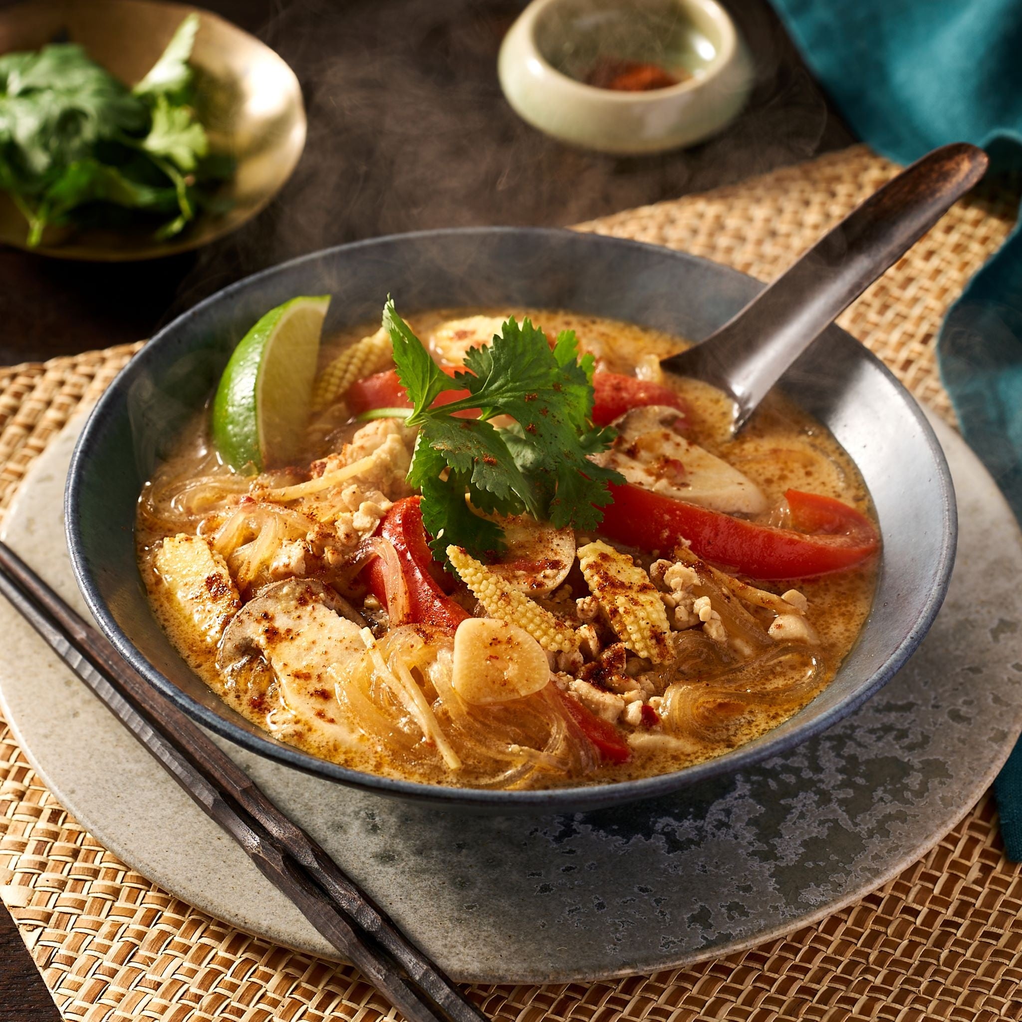 商品説明:タイのピリ辛スープ「トムカーガイ」を思わせるような、まろやかでスパイシーな味わいの春雨入りスープを中心にしたデリプレートです。
