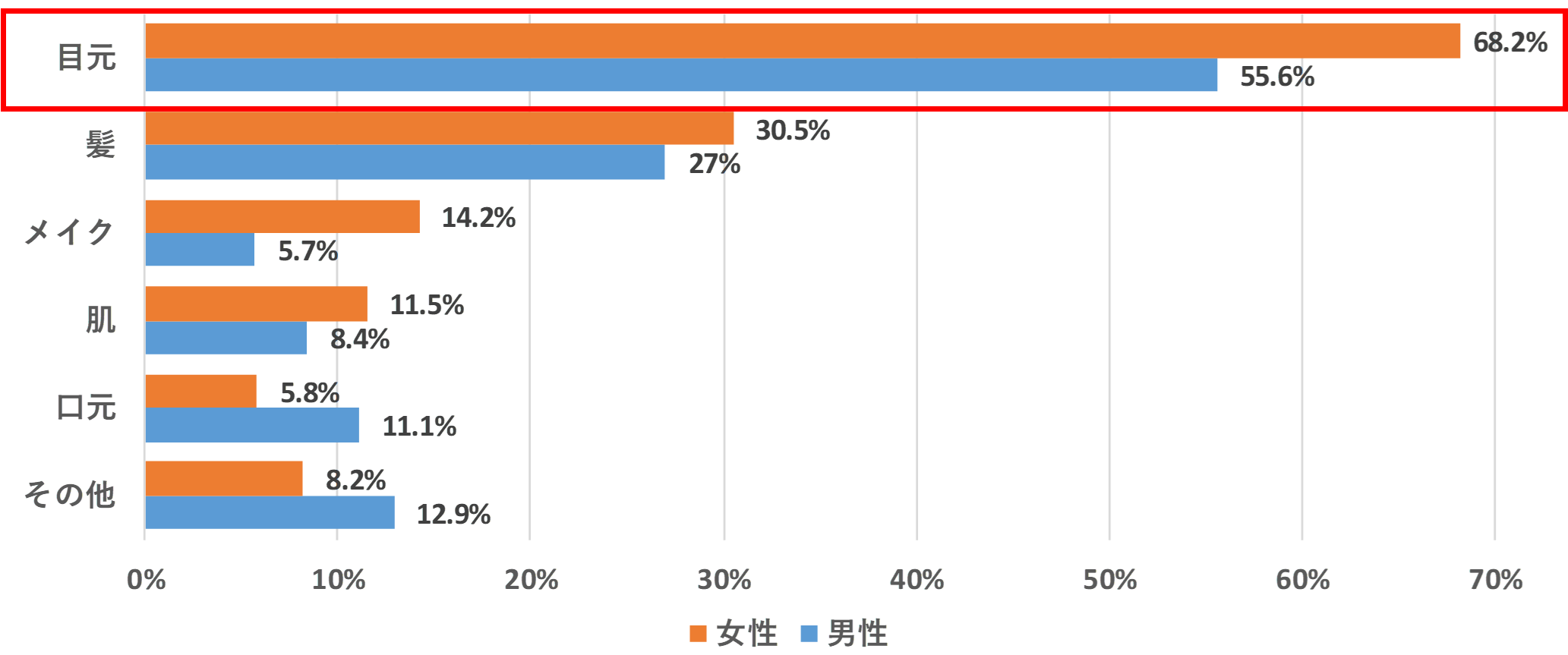 日常的にマスクを着用するようになり、オンライン会議など画面を通して相手の顔を見る機会が増えたことにより、他人の顔で目がいくようになった部分はあるか尋ねたところ、男女ともに「目元」(女性は68.2%、男性は55.6%)が最も多い回答で、次いで「髪」(女性は30.5%、男性は27%)に目がいくという結果になりました。マスクで隠れない目元や髪は、自然と目につきやすいようです。