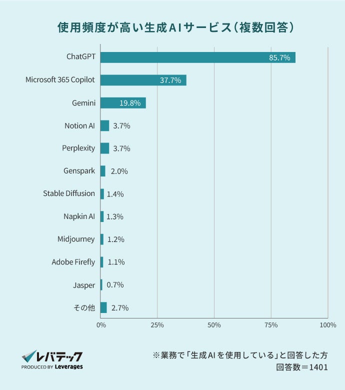 業務での活用状況について、生成AIを実際に業務で利用した経験がある人が4割を超えていることが分かりました。よく使用されているものとしては、「ChatGPT(85.7%)」が8割超えと圧倒的シェアを占め、ついで「Microsoft 365 Copilot(37.7%) 」「Gemini(19.8%)」と続きます。
