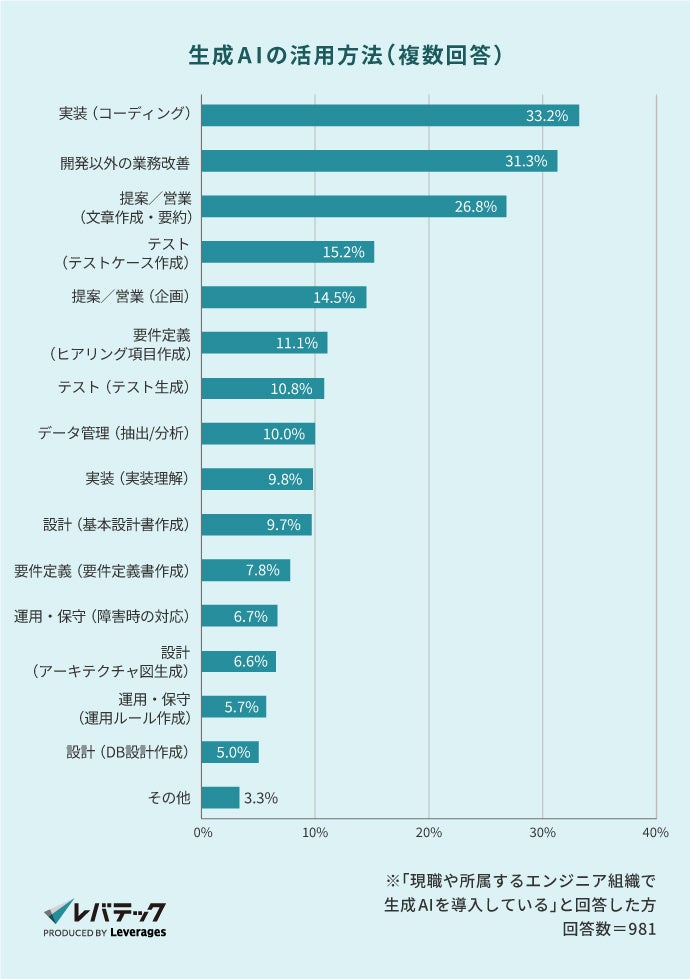 生成AIの活用方法としては、「実装(コーディング)(33.2%)」「開発以外の業務改善(31.3%)」「提案/営業(文章作成・要約)(26.8%)」が上位にランクインしました。その他、「テスト(テストケース作成)(15.2%)」「提案/営業(企画)(14.5%)」でも活用が見られ、幅広い業務で利用されていることが分かります。