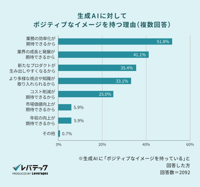 生成AIに対するイメージについては、約7割のIT人材が「ポジティブ」または「どちらかというとポジティブ」と回答しました。主な理由としては「業務の効率化が期待できるから(51.8%)」が最も多く、ついで「業界の成長と発展が期待できるから (41.1%)」「新たなプロダクトが生み出しやすくなるから (35.4%) 」と続きます。