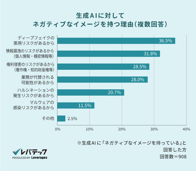 一方、約3割はネガティブなイメージを持っており、「ディープフェイクの悪用リスク(36.5%)」「情報漏洩リスク(31.8%)」「権利侵害のリスク(28.5%)」といった懸念の声も見受けられました。