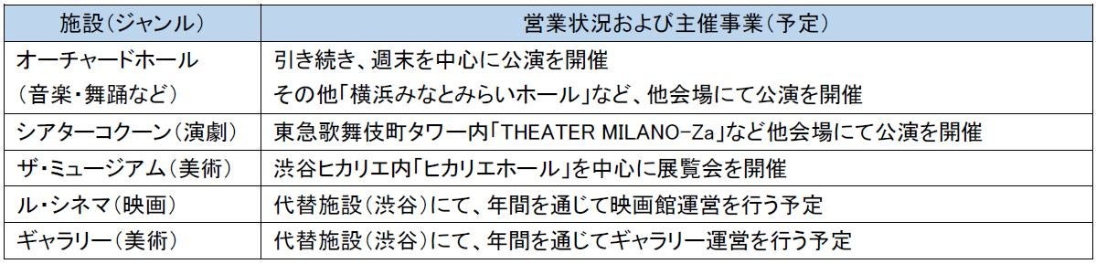 東急および東急文化村は、「Bunkamura」の休館中も週末を中心にオーチャードホールを限定営業するとともに、シアターコクーンを始めとするその他の機能は、渋谷だけでなく東急線沿線の周辺施設や東急グループ各施設などで活動を継続していきます。