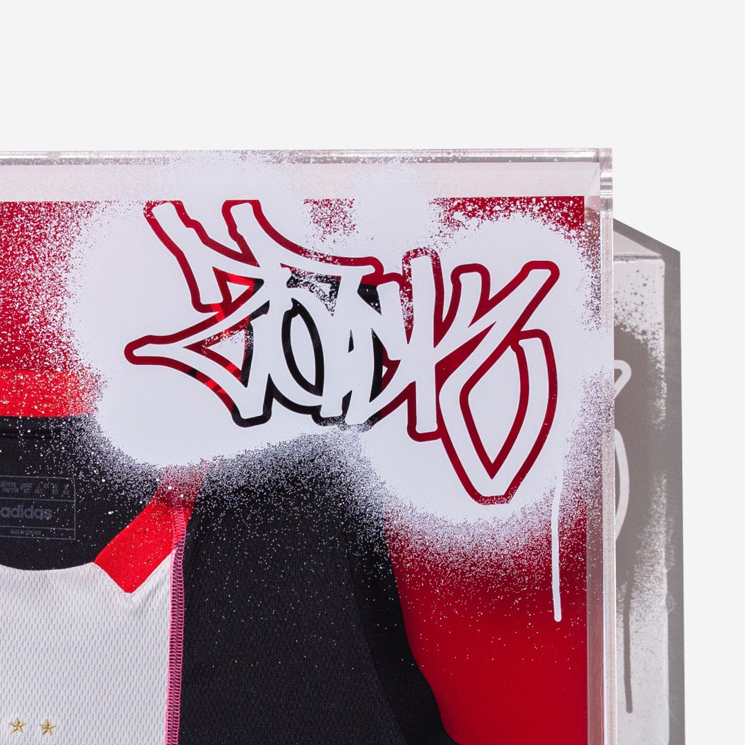 今回のプロジェクトでユニフォームを選択したのは、選手とファンを繋ぐ“絆”の象徴だと感じたからです。しかし、そのユニフォームもシーズンが終われば、新しいデザインに生まれ変わってしまいます。この企画でリメイクの手法を採用し、1点物のアートピースへと昇華した理由は、それぞれに様々なエピソードがあるホームとアウェイを繋ぎ合わせることで、シーズンという長い戦いをひとつに紡ぐと同時に、元々特別な存在であるユニフォームに新たな価値を宿してアーカイブしたいという思いからでした。こうした理由から額装も厚みのあるアクリルにすることで、目には見えない熱量や思い出も閉じ込めています。