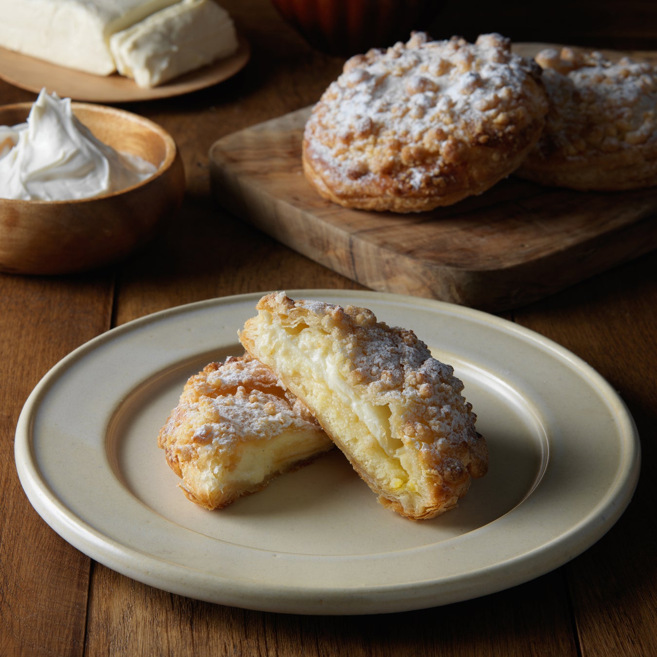 味わい深い2種のクリームにジェノワーズをしのばせ、チーズケーキのような味わいを演出。北海道産小麦を使用したサクサクの特製パイで包み込み、仕上げのメープルとトッピングのクランブルで、香ばしさと食感にアクセントをプラスしました。