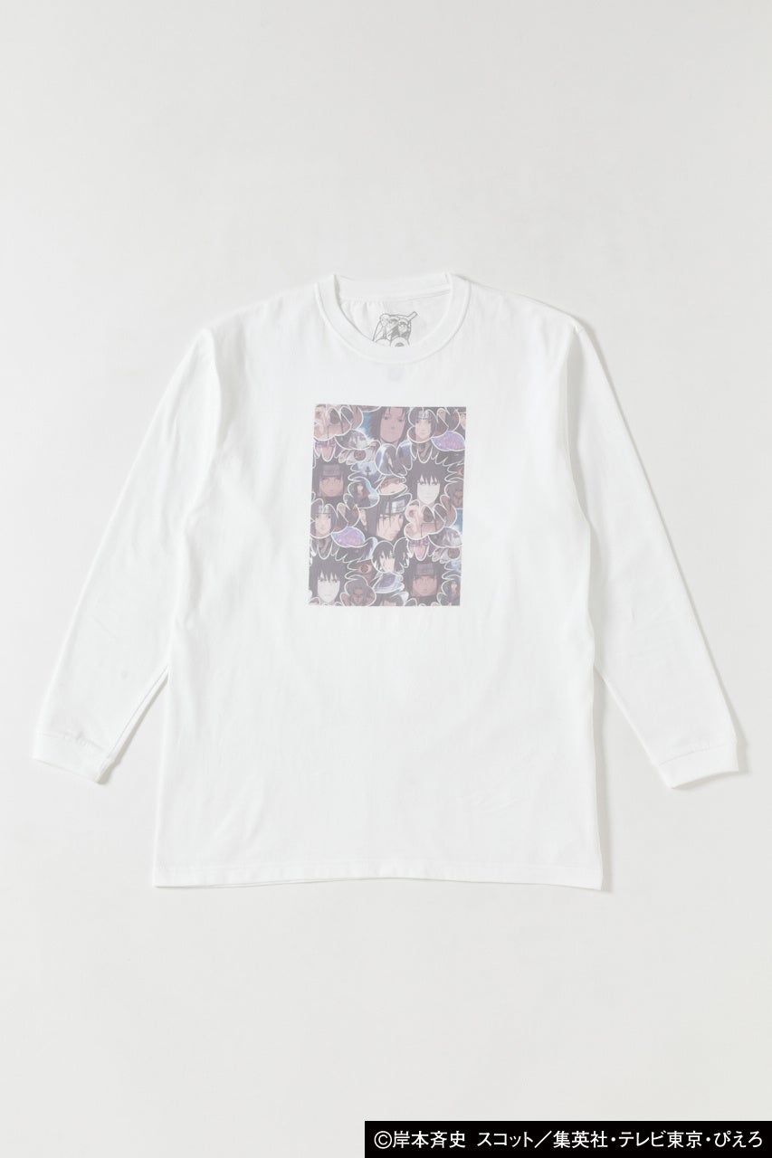 うちはサスケとうちはイタチの場面写やイラストを吹き出しコラージュのBOXにはめ込んだデザインのロングTシャツ。