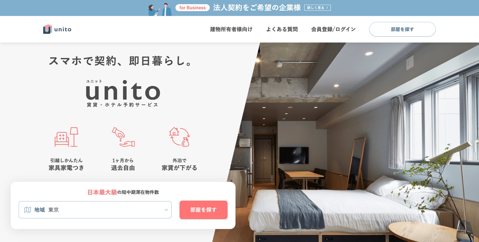 「多拠点居住」のカテゴリは2022年度版にもあったものの、その数は6から2023年度版では11と、約2倍に。ますます多拠点居住が広がりを見せています。例えば、賃貸・ホテル予約サービス「unito」は、2020年12月に正式版をリリースしましたが、ホテルレジデンスの運営物件数は454件、会員数5万人(2024年2月)を突破しました。