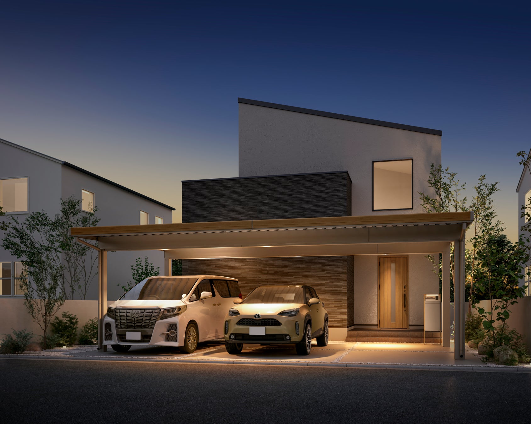 住宅外観に調和するシンプルなデザインで、台風や強風に強い業界最高水準の耐風圧強度(V0=46m/s)の折板カーポート「カーポートSW」と直線的な機能美にこだわり、大雪にも耐える業界最高水準の耐積雪強度6000N/㎡(200㎝相当)の折板カーポート「カーポートST」に新たなサイズを追加し、多様化する車のサイズや住宅面積に対応しやすくなります。また、「カーポートSW」「カーポートST」では、ダウンライトに加えて2024年10月よりユニバーサルダウンライトを先行して展開し、雪が積もっても住宅のファサード空間を照らすことが可能です。