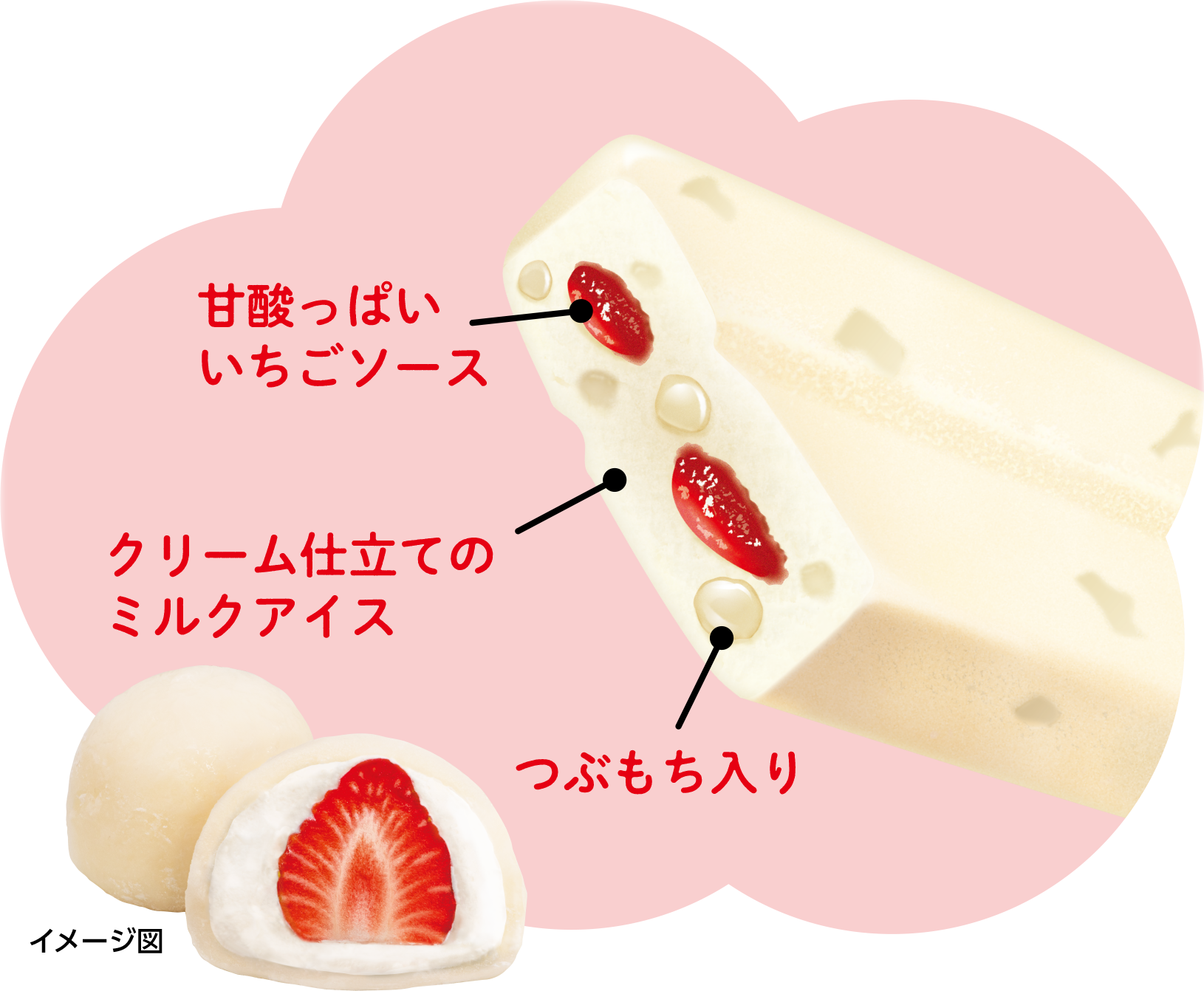 「いちごみるく大福バー」をぜひお召し上がりいただき、ミルクアイス、餅、いちごソースの複合的な食感をご堪能ください。