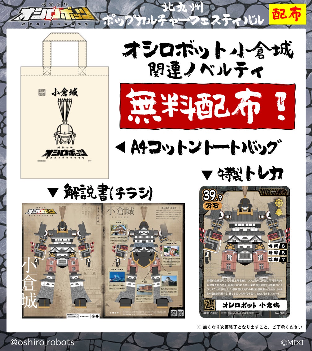 出展内容:オシロボット小倉城関連ノベルティ配布(トートバッグ、解説書、特製トレカ)、物販