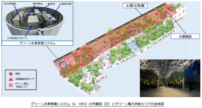 野村不動産株式会社(本社:東京都新宿区/代表取締役社長:松尾 大作、以下「野村不動産」)は、東京大学先端科学技術研究センター(所在地:東京都目黒区/所長:杉山 正和、以下「東大先端研」)との「カーボンニュートラル技術拠点に関する連携」※1活動の一環として、「BLUE FRONT SHIBAURA」(以下「本プロジェクト」)の外構部分であるGREEN WALKにおいて、株式会社日立製作所(本社:東京都千代田区/執行役社長兼CEO:小島 啓二、以下「日立」)設計施工の『グリーン水素発電システム:G-HES(Green Hydrogen Energy System)』(以下「本システム」)を構築・導入したことをお知らせします。