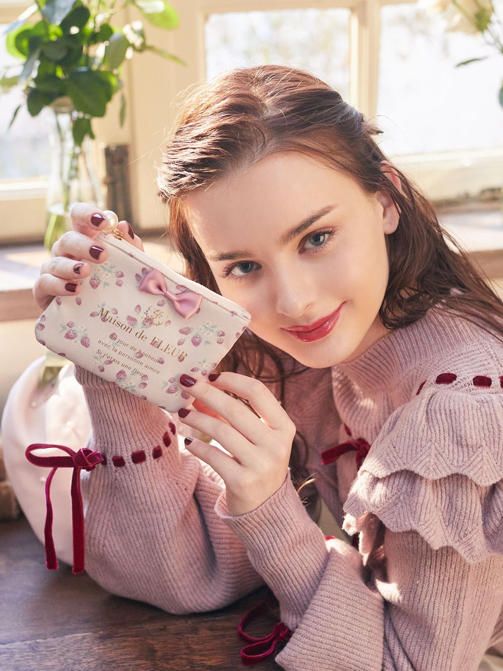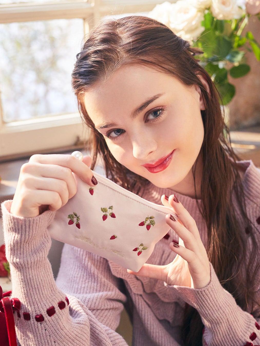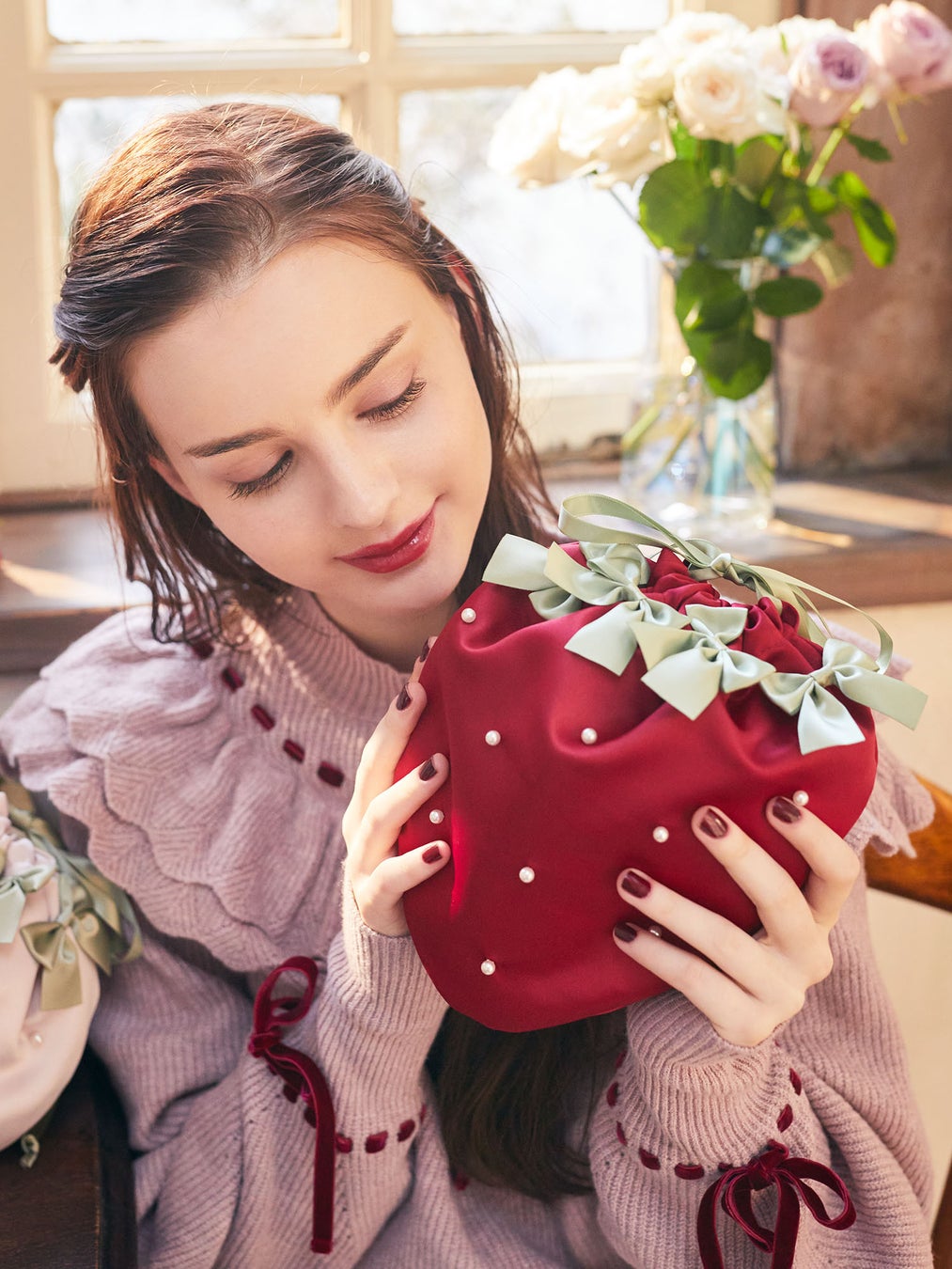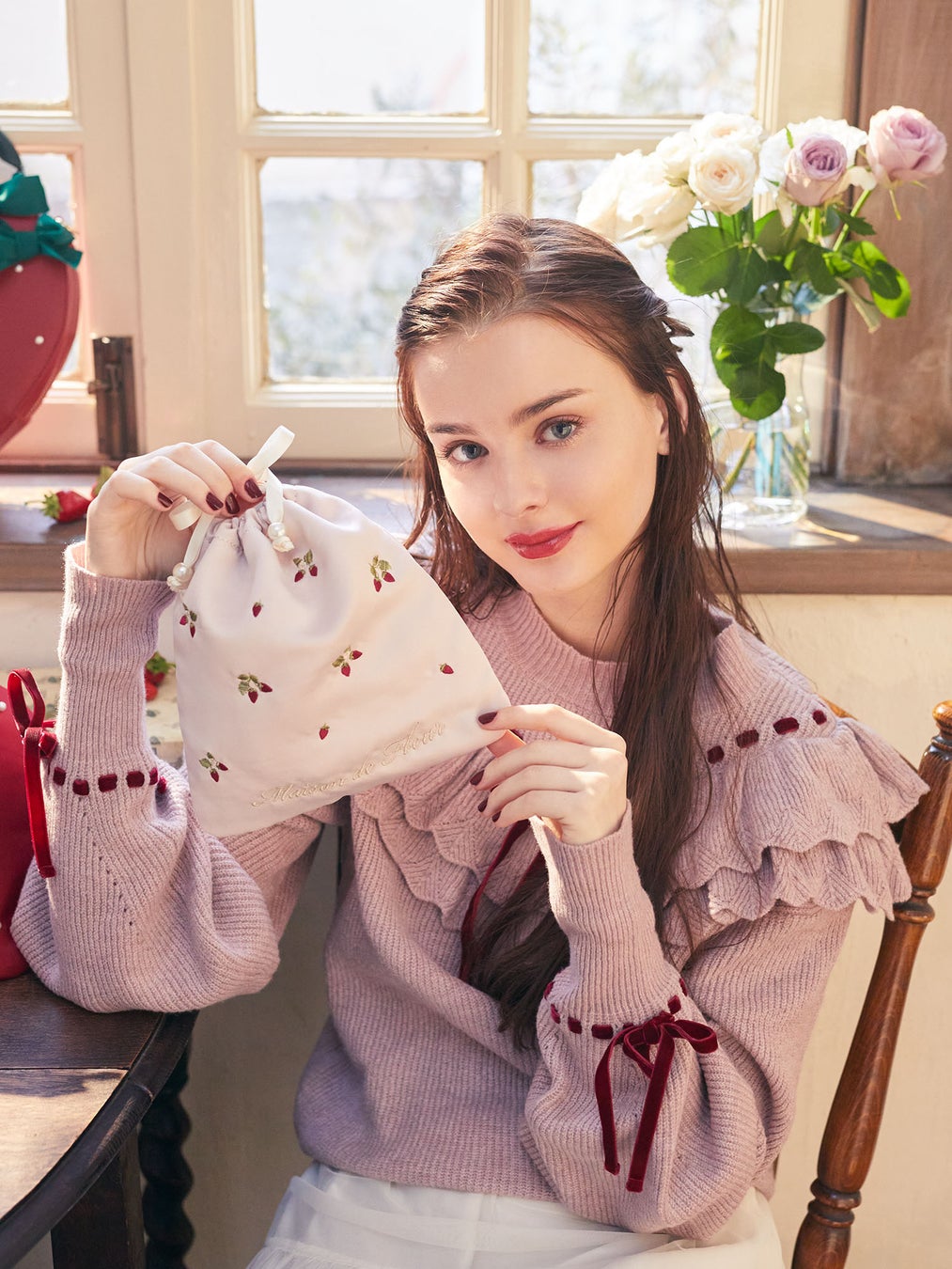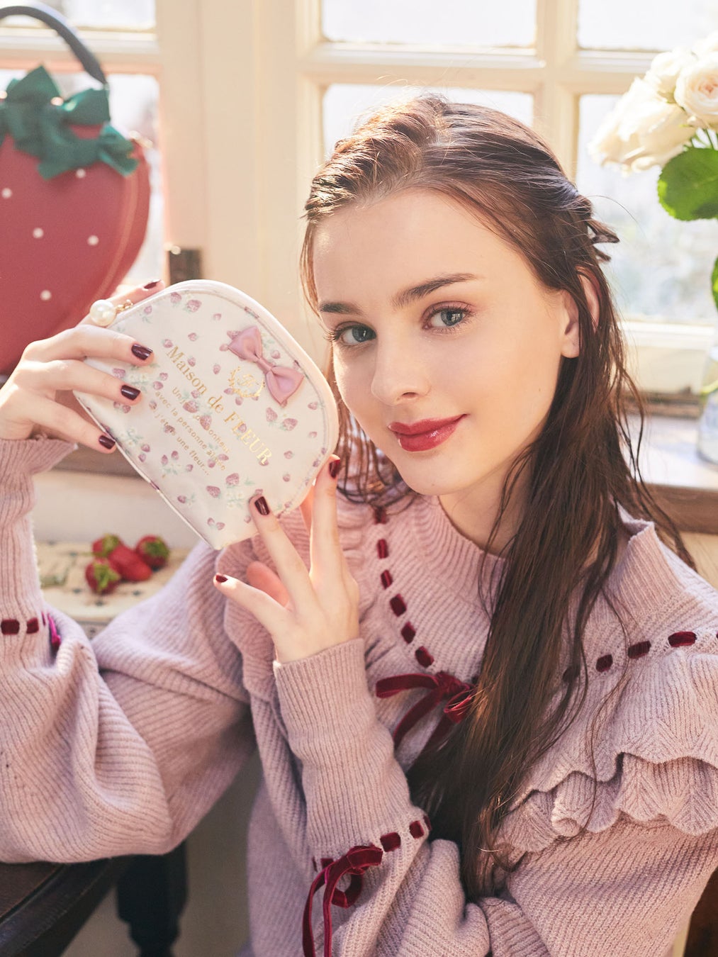 中でも一押しは、いちごの形をそのままバッグにした「いちごショルダーバッグ」です。種はパール、へた部分はリボンで表現したMaison de FLEURらしいデザインに仕上げました。身に着けるだけで一気に華やかさを演出してくれるアイテムです。また、サテン生地の巾着もご用意。ジューシーな赤と可愛らしいピンク、上品なアイボリーの3色をラインアップいたしました。
