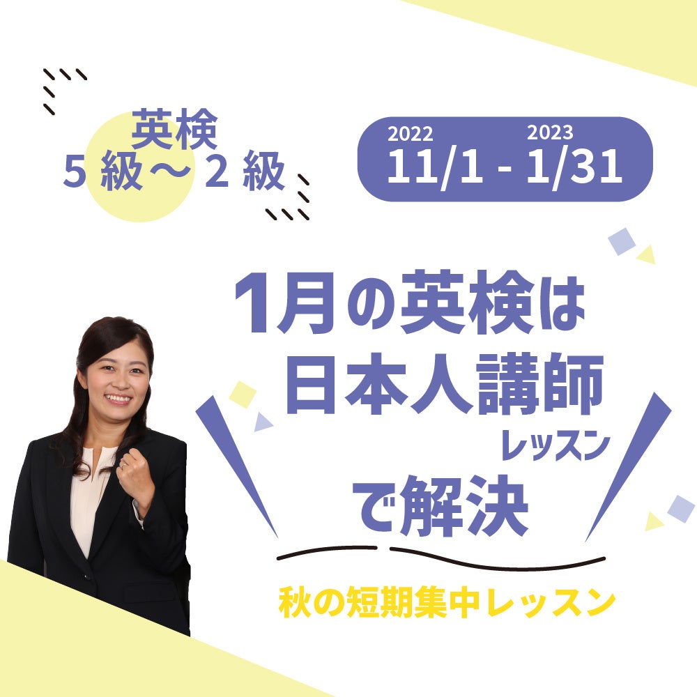 株式会社増進会ホールディングス(Z会グループ)のグループ会社、株式会社シェーンコーポレーション(本社:東京都千代田区 代表取締役社長:石谷雄也)が運営する英会話スクール「シェーン英会話」は、1月英検®で5級~2級に挑戦する方向けの直前対策レッスンを2022年11月から2023年1月に開催します。レッスンはいずれも日本人講師が教えるマンツーマンの回数制。問題を解く感覚に慣れるとともに、基礎力UPや弱点強化等、合格に向けての力を身につけていきます。