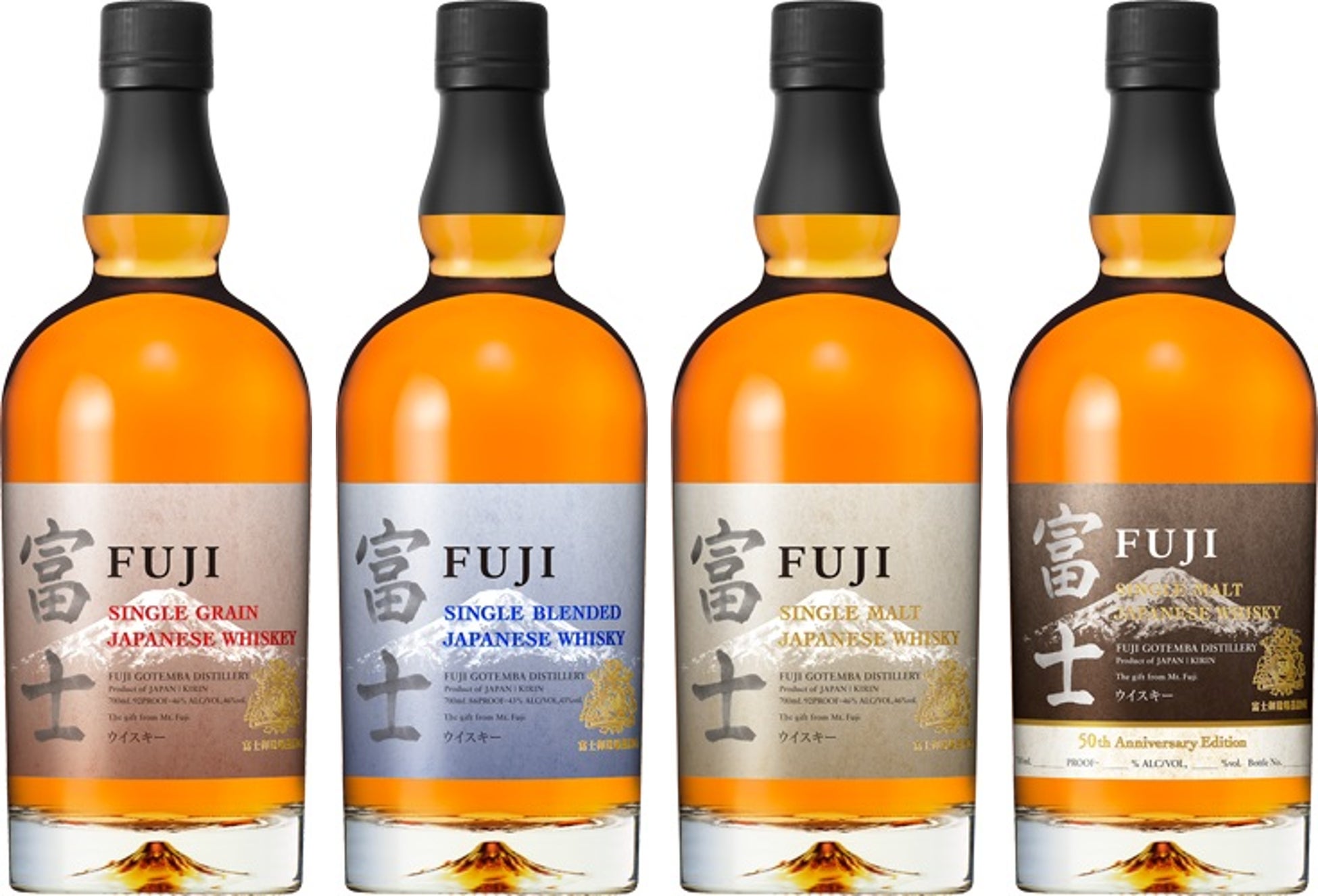 左から「キリン シングルグレーンジャパニーズウイスキー 富士」(7月製造よりパッケージリニューアル)、「キリン シングルブレンデッドジャパニーズウイスキー 富士」(7月製造よりパッケージリニューアル)、「キリン シングルモルトジャパニーズウイスキー 富士」、「キリン シングルモルトジャパニーズウイスキー 富士 50th Anniversary Edition」(2023年5月23日(火)12:00~2023年6月15日(木)15:00の応募期間による抽選販売を実施し、販売終了)