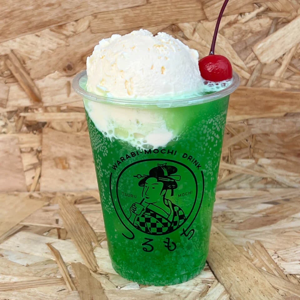 つるもちは、新食感の和スイーツ、わらび餅ドリンクを提供しております。北海道の希少な本わらび粉と、濃厚な沖縄黒糖を練りこんだ本格的なわらび餅を使用しています。今日は特別においし、なつかし、クリームソーダもご用意しています!味と食感の予想を超えていけ!一度ご賞味あれ!