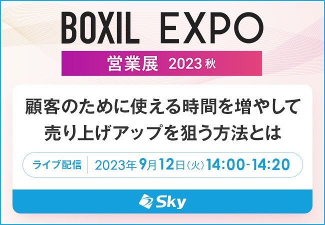 Sky株式会社が「BOXIL EXPO 営業展 2023 秋」にて、『顧客のために使える時間を増やして売り上げアップを狙う方法とは』をテーマにセミナーを実施いたします