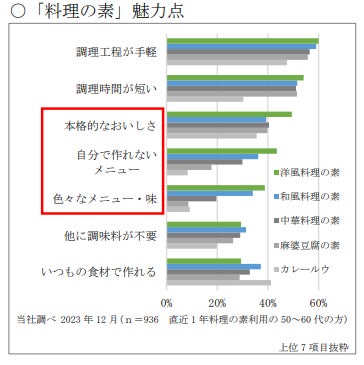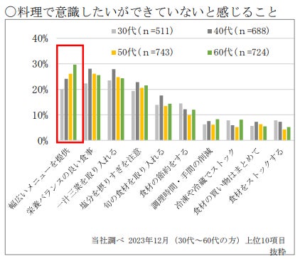 年齢が上がるにつれて、食事メニューのバリエーションを増やしたいという意識が高くなります。これは、メニューのマンネリ解消だけでなく、非日常的な体験へのニーズによるものです。特に、洋風料理の素に対しては、「本格的」で「自分では作れないメニュー」が求められています。