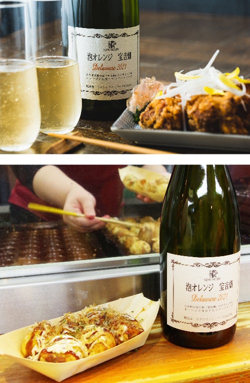 吉を呼ぶ宝の畑「宝吉畑(ほうきちばたけ)」で栽培されたデラウェアをオレンジワインの製法で仕込み、瓶内二次発酵させた、にごりタイプのスパークリングワインです。鮮やかなオレンジ色、デラウェアの華やかな果実の香り、心地よい苦み、余韻の長さなど、さまざまな表情をもっており、和食はもちろん、洋食や中華まで使い勝手も抜群。「カタシモワイナリー」を代表するデラウェアのスパークリングワイン「たこシャン」の高級版のような感覚で、大阪名物の"粉もん"から、餃子や唐揚げ、割烹料理まで、幅広い料理と合わせてお楽しみください。
