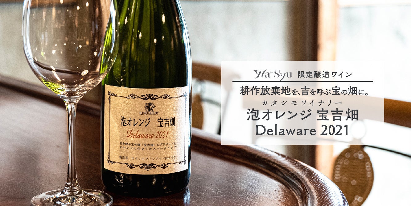 「カタシモワイナリー」では、SDGsが叫ばれる以前から地場産業の衰退や高齢化による耕作放棄地の急増などで抱える問題について 取り組みをおこなっています。その一貫として立ち上げた「宝吉畑プロジェクト」のひとつとして、「放棄地(ほうきち)」をおめでたい「宝吉(ほうきち)」と呼び、"吉を呼ぶ宝の畑=宝吉畑(ほうきちばたけ)"として活用する持続可能な取り組みを進めています。今回、wa-syu限定醸造としてリリースされたスパークリングワインは、この宝吉畑で生まれたデラウェアを100%使用。種なしにするためのジベレリン処理や除草剤なども使わずにのびのびと育った果実が、華やかな果実の香りを放ちます。オレンジワインの醸しの技が、鮮やかなオレンジ色と心地よい苦みをもたらし、より余韻の長い味わいを生み出しています。耕作放棄地を荒れ地や宅地にしないように"吉を呼ぶ宝の畑"に蘇らせることは、地域の景観を守り、柏原地区のワインの価値を上げることにも繋がっています。