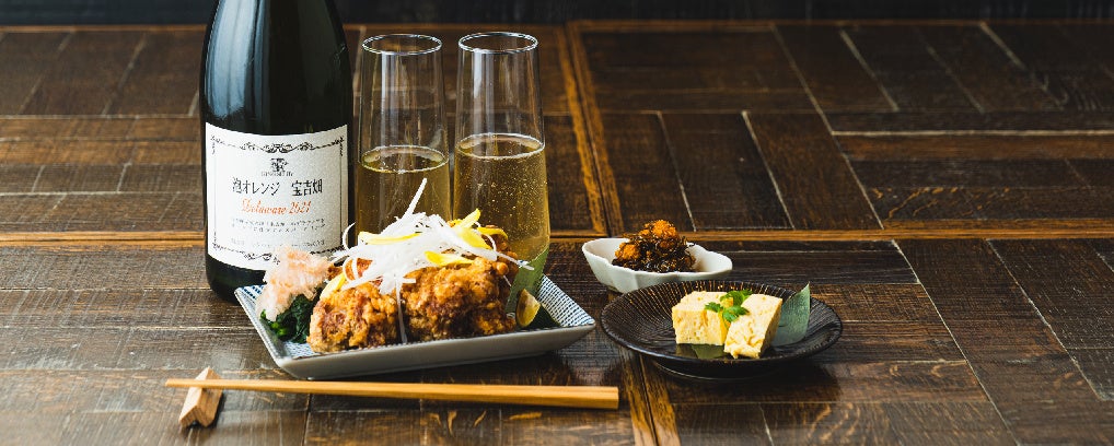 5代目・高井麻記子氏のチャレンジから誕生した、wa-syu限定醸造「泡オレンジ 宝吉 畑 デラウェア 2021」。泡のすっきり感と、無濾過でにごりを残したことによって生まれる味わい深さ、オレンジワインの醸し技による複雑味で、さまざまな表情を持つ瓶内二次発酵のスパークリングワイン。そのペアリングの妙味を wa-syuが解説します。