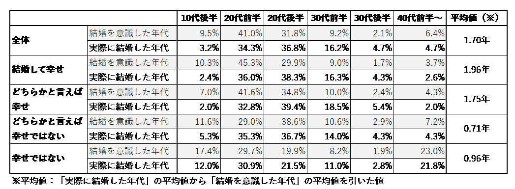 さらに、結婚を意識してから実際に結婚(入籍)するまでの期間(※平均値)を見ると、結婚して「幸せ」を感じている人は約2年、「幸せではない」とした人は約1年で、約2倍の差がありました。