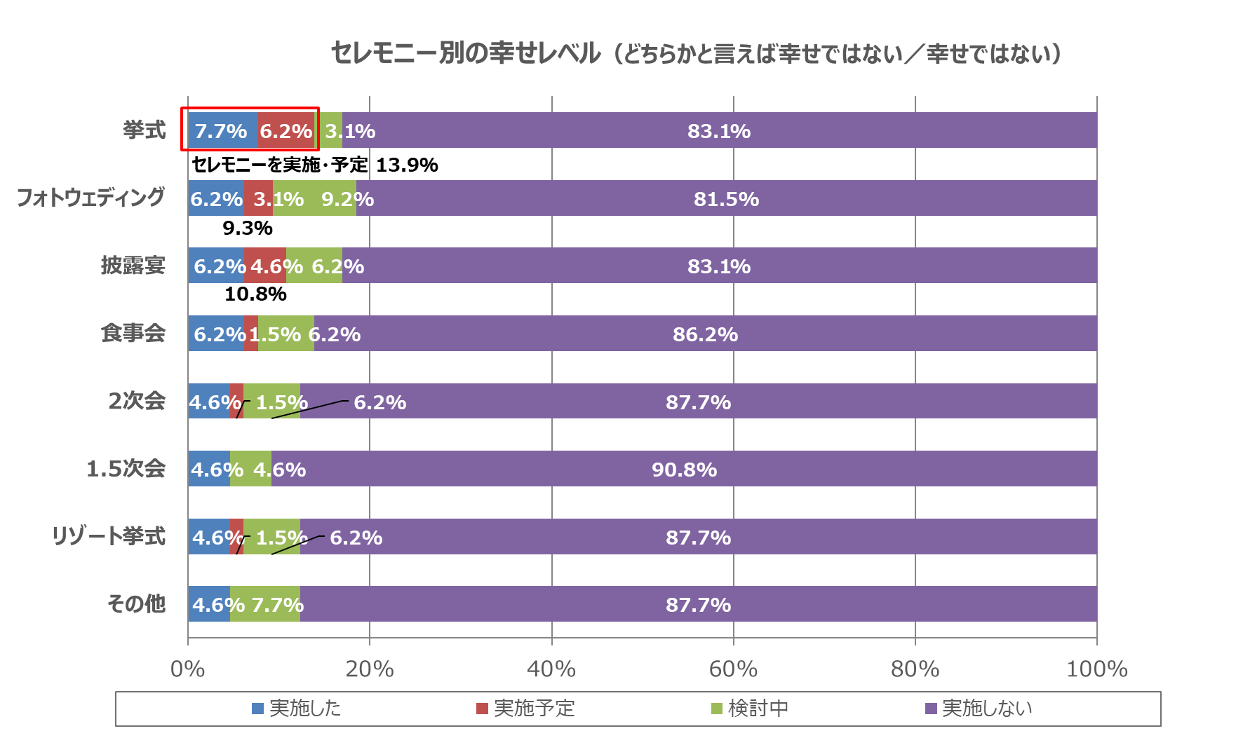結婚に関わるセレモニーは、夫婦で初めての共同作業でもあります。その過程で、絆を深めるカップルも多くいるでしょう。実際に、結婚して「幸せ」を感じている人のセレモニー実施率は、幸せではないとした人の約3倍でした。セレモニー別に見ると、「挙式」は約3倍、フォトウェディングは約4倍、「披露宴」は約3倍となっています。