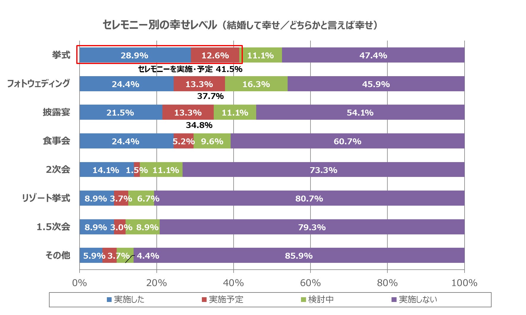 最も多く実施されたセレモニーは「挙式」(30.8%)で、次いで「フォトウェディング」(26.3%)、「披露宴」(25.5%)、「食事会」(21.3%)となっています。