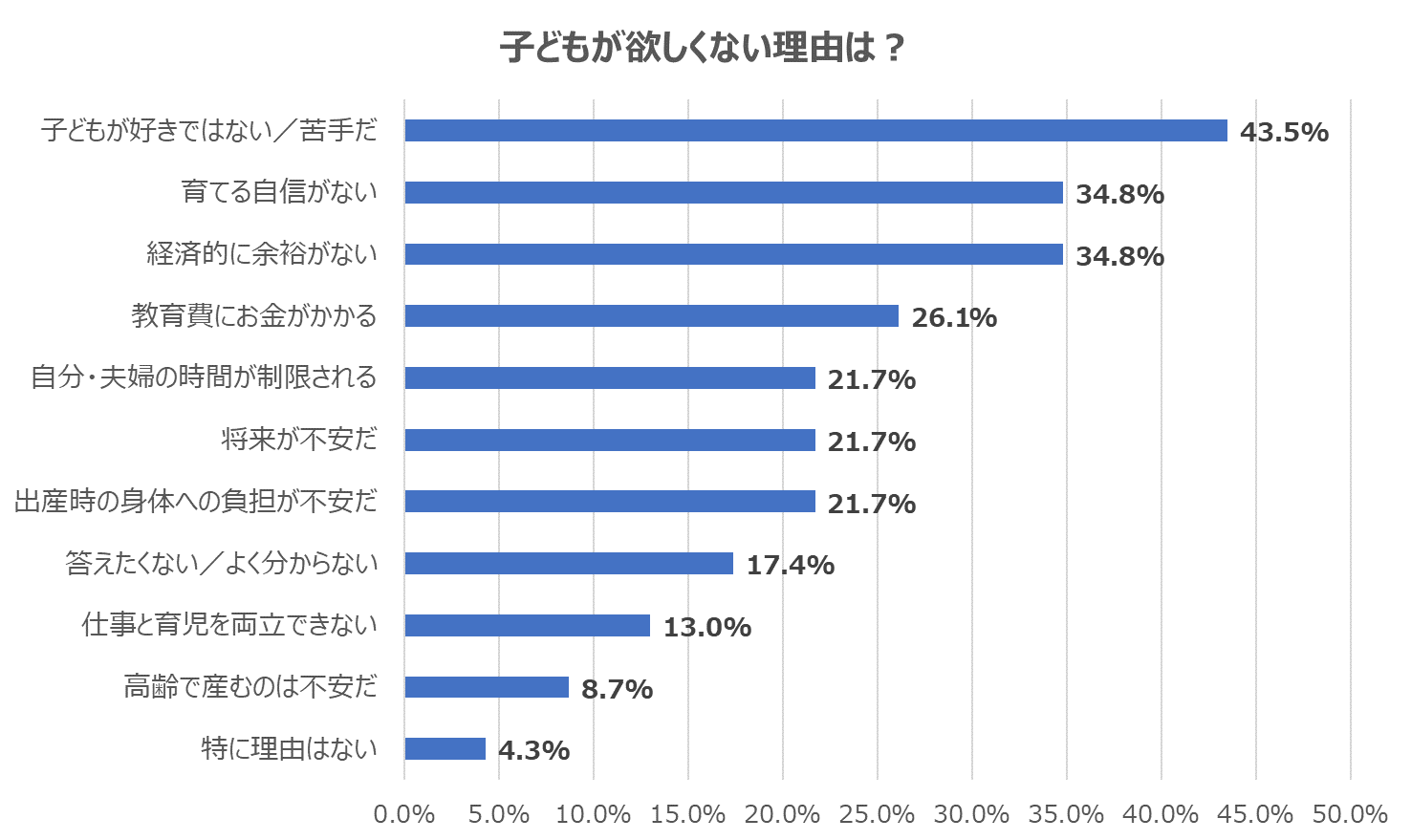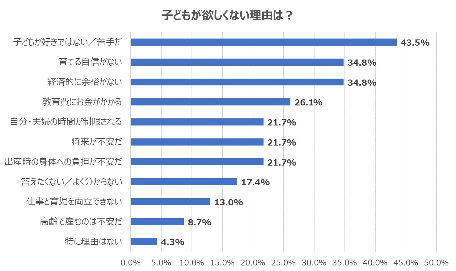 一方で、欲しくない理由として最も多かったのが「子どもが好きではない」(43.5%)でした。この他に、「経済的に余裕がない」(34.8%)、「教育費にお金がかかる」(26.1%)など、金銭的な面からの理由も見られました。