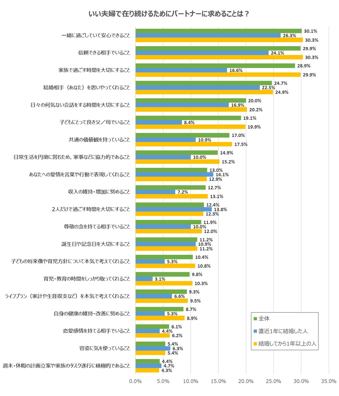 このほか、直近1年に結婚した人では、結婚1年以上の人に比べて「2人だけで過ごす時間を大切にすること」(+1.5ポイント)、「愛情を言葉や行動で表現してくれること」(+1.2ポイント)、「容姿に気を使っていること」(+0.9ポイント)が上回っていました。新婚と言われる時期には、恋人のような関係性も大切にしているようです。
