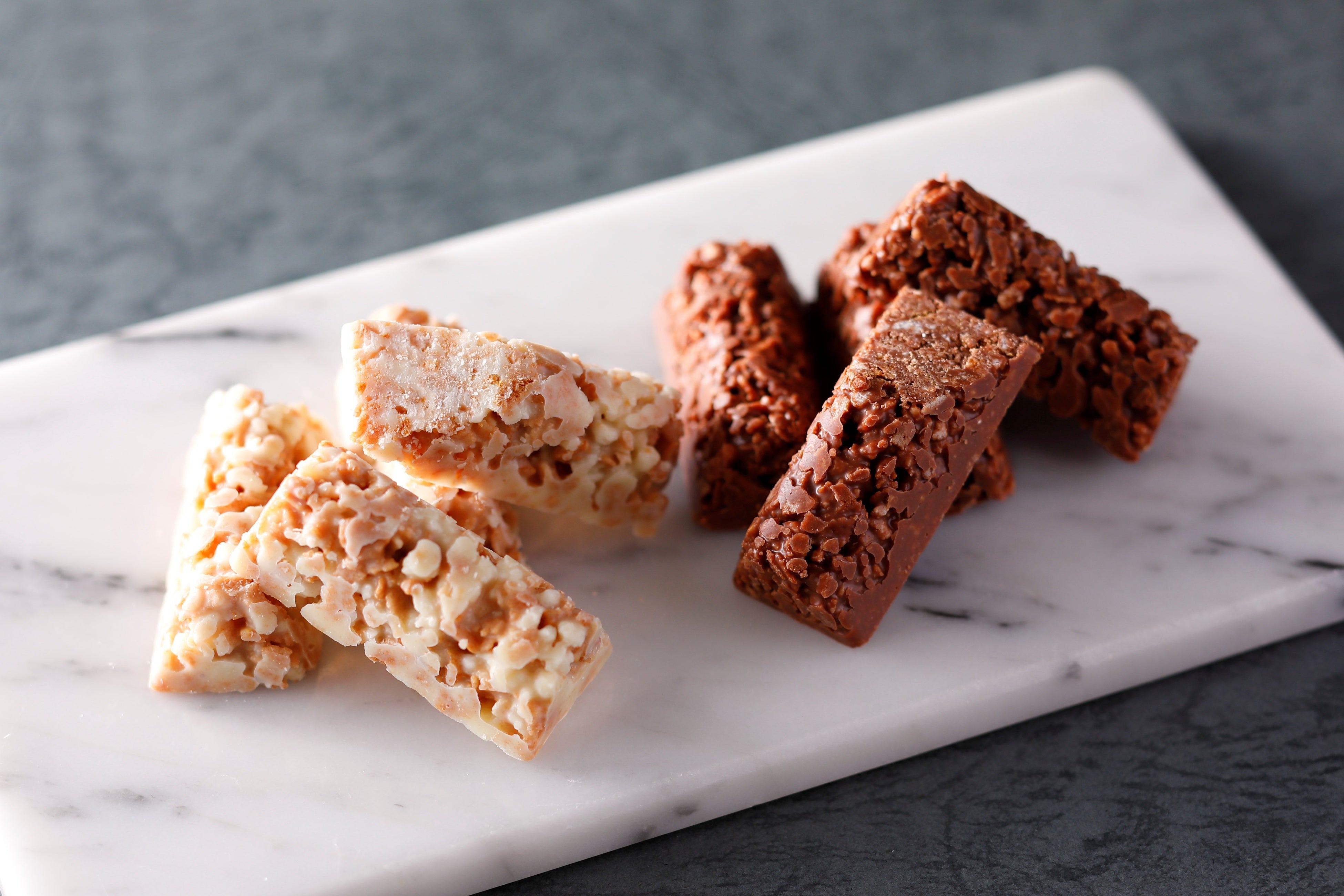 口どけの良いチョコレートに練り込んだ、砕いたフイユティーヌ、クッキーなどが、さくさくと浮き立つような食感を演出します。