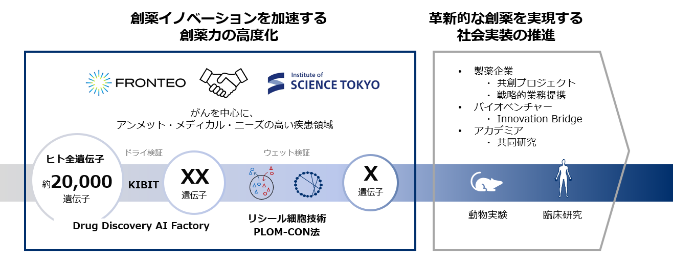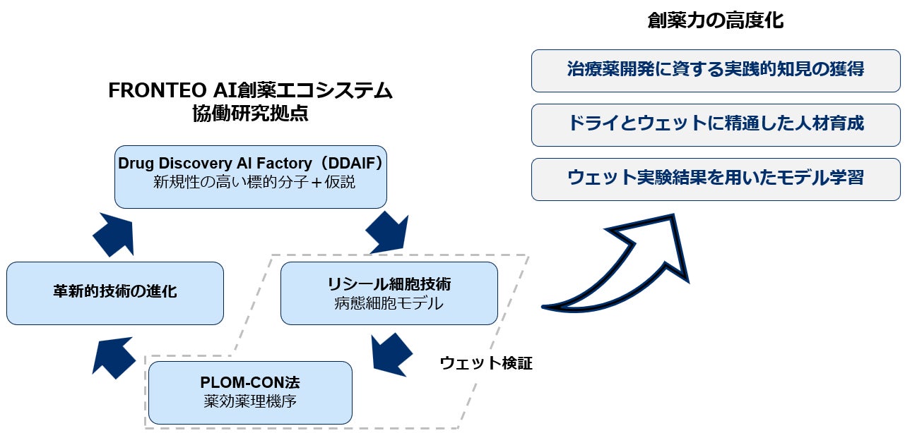 本拠点では、FRONTEOがAI「KIBIT」を用いた創薬標的分子候補の抽出および作用メカニズムの仮説構築(ドライ研究)を行い、東京科学大学が実験検証(ウェット研究)を迅速に実施します。さらに、実験結果を再びAI解析に還元することで、仮説生成と検証を循環させる「仮説検証ループ」を高水準で実現し、創薬成功確率の飛躍的な向上を目指します。