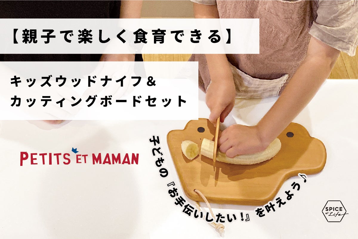 子どもの「お手伝いしたい!」を叶える【親子で楽しく食育できるカッティングボードセット】をお届け。初めてのお手伝いは、かわいい木製の包丁とカッティングボードでデビュー!きっと料理が好きになる!