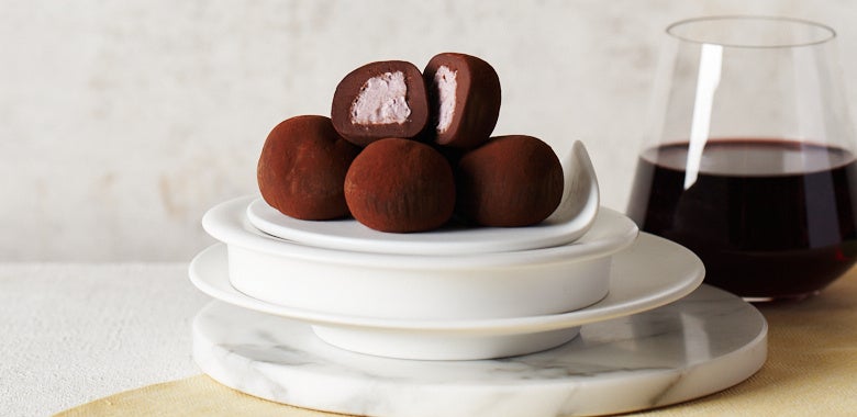 ワインを製造する工程でぶどうを絞った後に残る果皮・種(ワインパミス)をアップサイクルしました。クリームと合わせ、ビターなチョコレートで包んだ生チョコトリュフです。なめらかに舌の上で口どける濃厚な生チョコと、ほのかなワインの風味が楽しめ、大切な方へのギフトとしてもおすすめです。