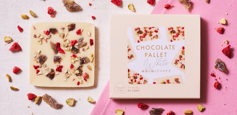 梅酒を漬ける時に使われる梅から作られたドライフルーツと、検品で使用されなくなった割れピスタチオを、チョコレートに華やかにトッピングしたホワイトチョコパレットです。フリーズドライの苺をアクセントに添えて、彩り豊かに仕上げました。口溶けよく、くどくない甘さのホワイトチョコレートは、梅酒ドライフルーツのさわやかな甘酸っぱさを引き立てます。