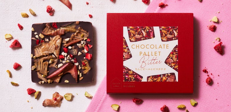 カットりんご工場で未活用だったりんごの皮から作られたチップスと、検品で使用されなくなった割れピスタチオを、チョコレートにトッピングしたビターチョコパレットです。フリーズドライの苺をアクセントに添えて、華やかに仕上げました。口溶けよく、甘さ控えめなビターチョコが、りんごの皮チップスの優しい甘みとよく合います。