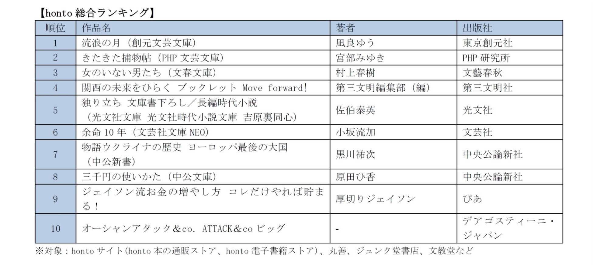 『流浪の月』『女のいない男たち』(映画「ドライブ・マイ・カー」原作収録短編集)『余命10年』と話題の映画原作本が総合ランキングに続々登場!