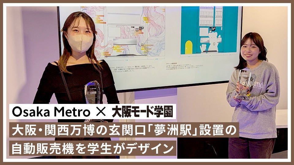 ファッション・デザイン・ビジネスからインテリア、グラフィック、美容師のプロを育てる専門学校「大阪モード学園」は、Osaka Metroとの産学連携プロジェクトにて、2025年1月19日に開業予定のOsaka Metro中央線「夢洲駅」に設置される自動販売機のラッピングデザインを決定する「夢洲駅未来イメージコンテスト」を実施しました。11月11日、表彰式が大阪モード学園にて行われ、全30点のデザインの中から、「通常自販機」と「子育て支援(ベビー用品あり)自販機」それぞれの最優秀デザインに選ばれたグラフィック学科の学生2名が表彰されました。