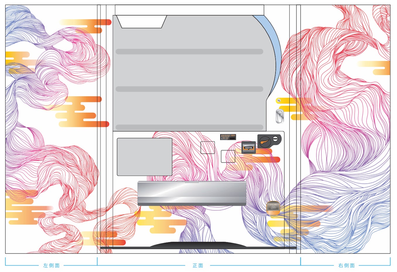 コンセプトは日本の「和」と世界の調和です。日本のモチーフ「水引」や「霞文様」を使用しています。水引は” 魔除け・幸運・祝福”、霞文様は”永遠”の意味があり、万博の成功と安全を祈る自販機デザインです。水引は繊細に動的に配置し、生命力を感じてもらえるように制作しました。