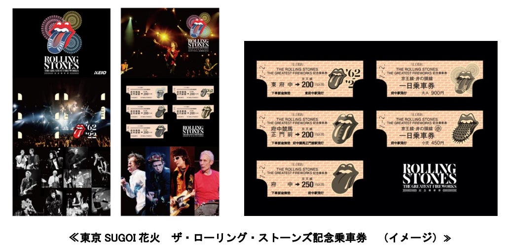 「東京SUGOI花火 ザ・ローリング・ストーンズ記念乗車券」は、デザインが異なる硬券乗車券5枚を写真家:有賀幹夫氏のライブ写真を使用した台紙にセットしたもので、1セット2,000円(税込み)で3,000セットを数量限定で京王線府中競馬正門前駅改札外特設スペースと記念きっぷと鉄道雑貨のウェブマルシェ「きっぷと鉄こもの」サイト内で発売します。