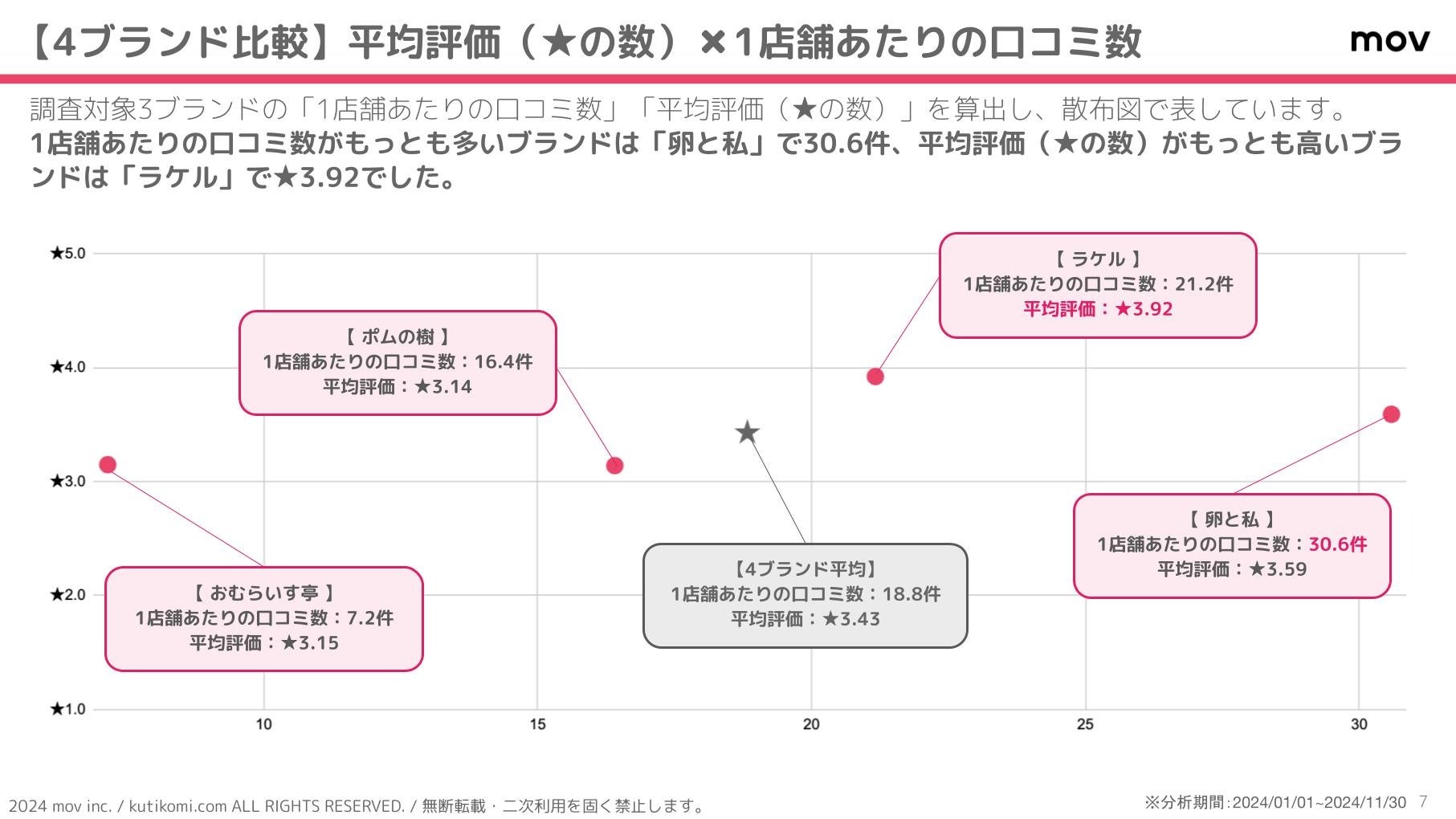 こちらの散布図では、調査対象4ブランドの「1店舗あたりの口コミ数」「平均評価(★の数)」を算出しています。1店舗あたりの口コミ数がもっとも多いブランドは「卵と私」で30.6件、平均評価(★の数)がもっとも高いブランドは「ラケル」で★3.92でした。
