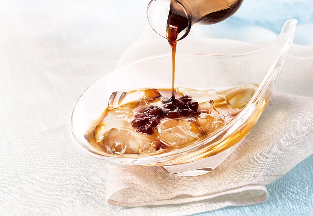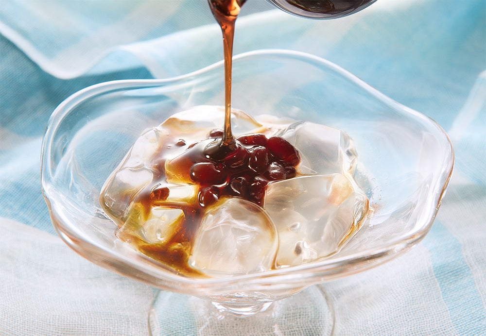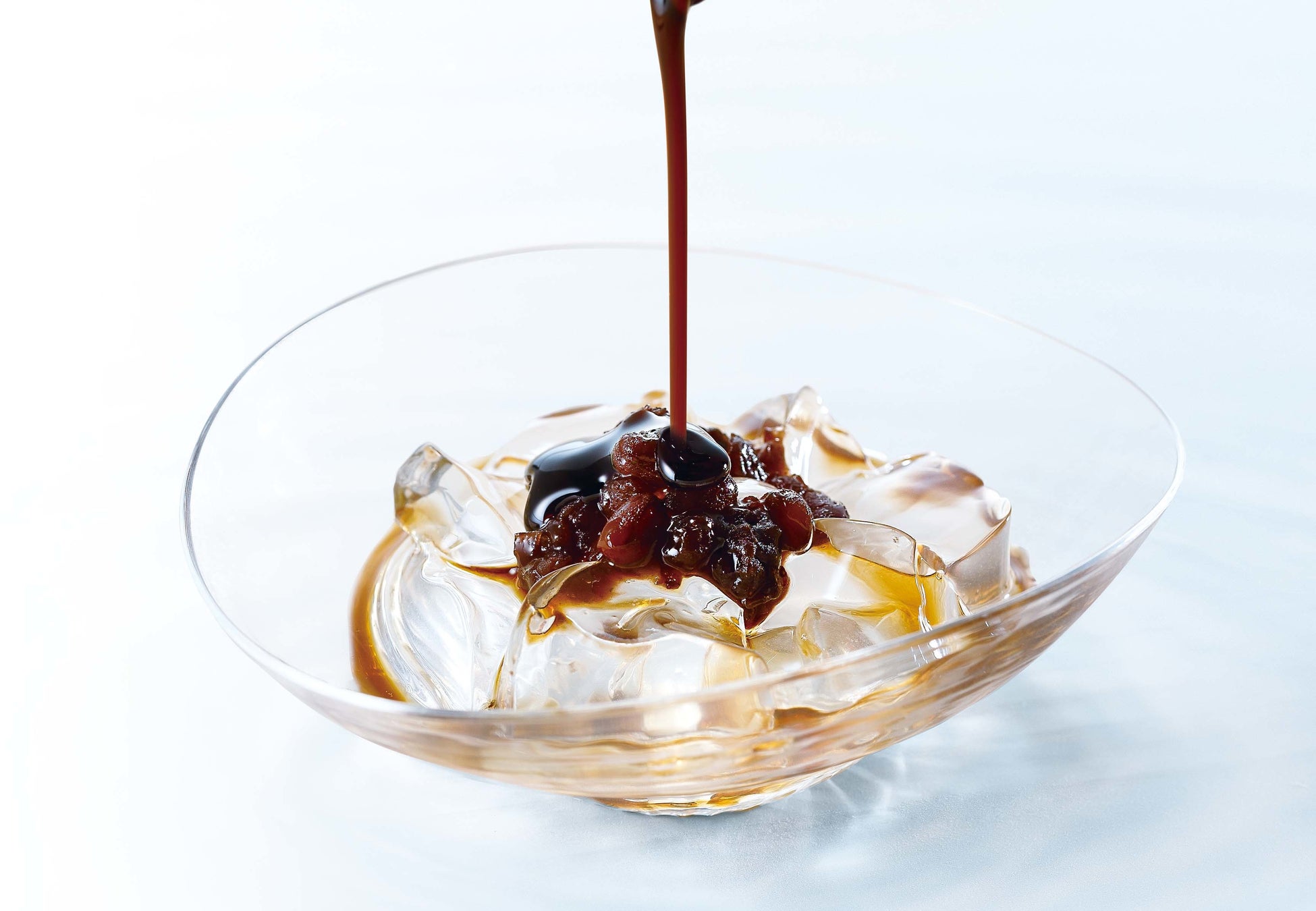 スプーンですくうだけでわかる、ぷるぷるの天然水ゼリー。つるりと飲み込んで、とろりと口どける“一瞬の涼”をお楽しみいただけます。ひんやり冷やして、北海道産の小豆あんと沖縄産黒糖使用の黒蜜をかけてお召し上がりください。(※小豆あんと黒蜜は『水あんみつ』1個にそれぞれ1つずつ個装内に入っています。)