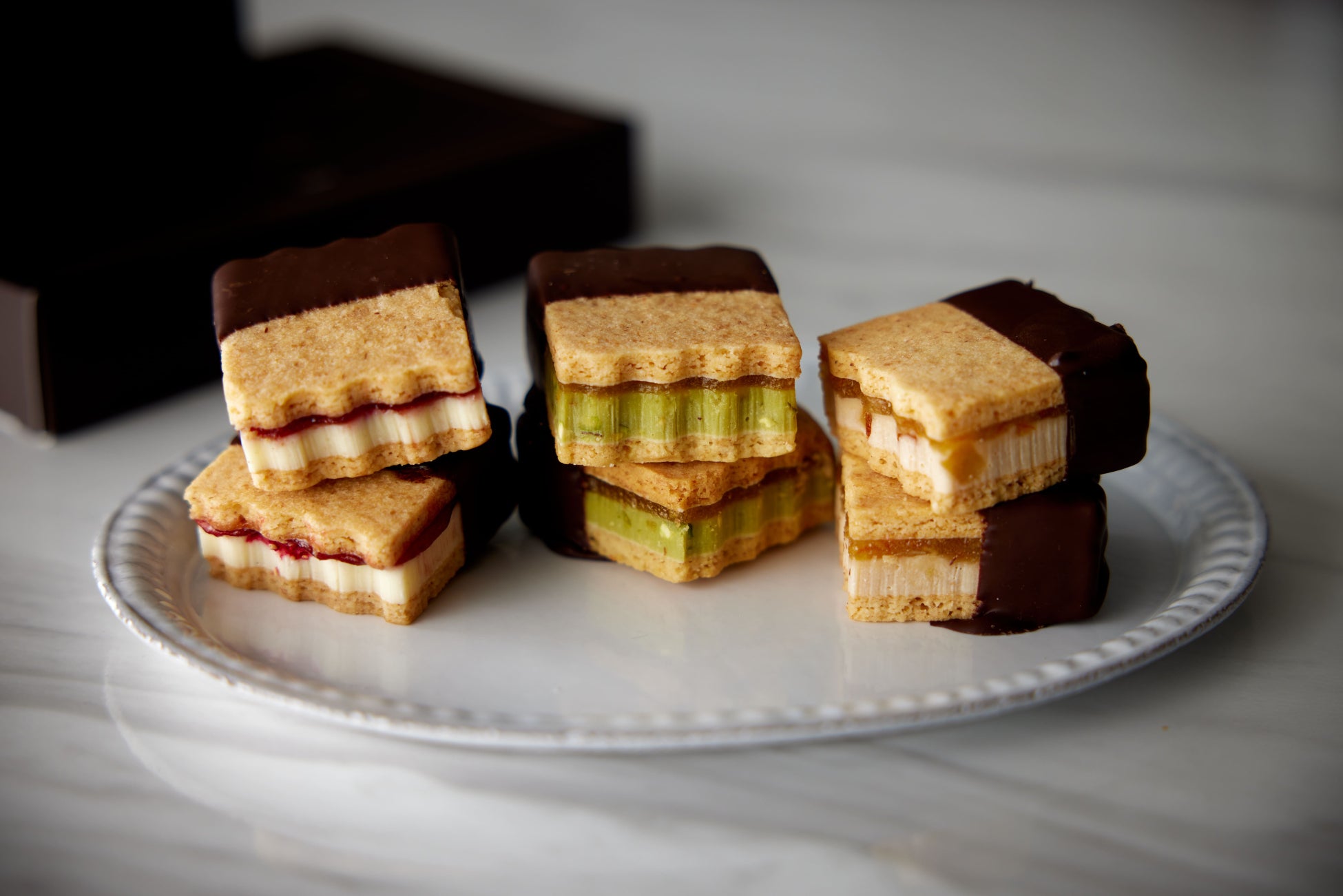 香ばしい全粒粉入りのビスケットの間にガナッシュとフルーツコンフィチュールをたっぷり挟み込んだ、食べ応えのあるチョコレートクッキーサンド。