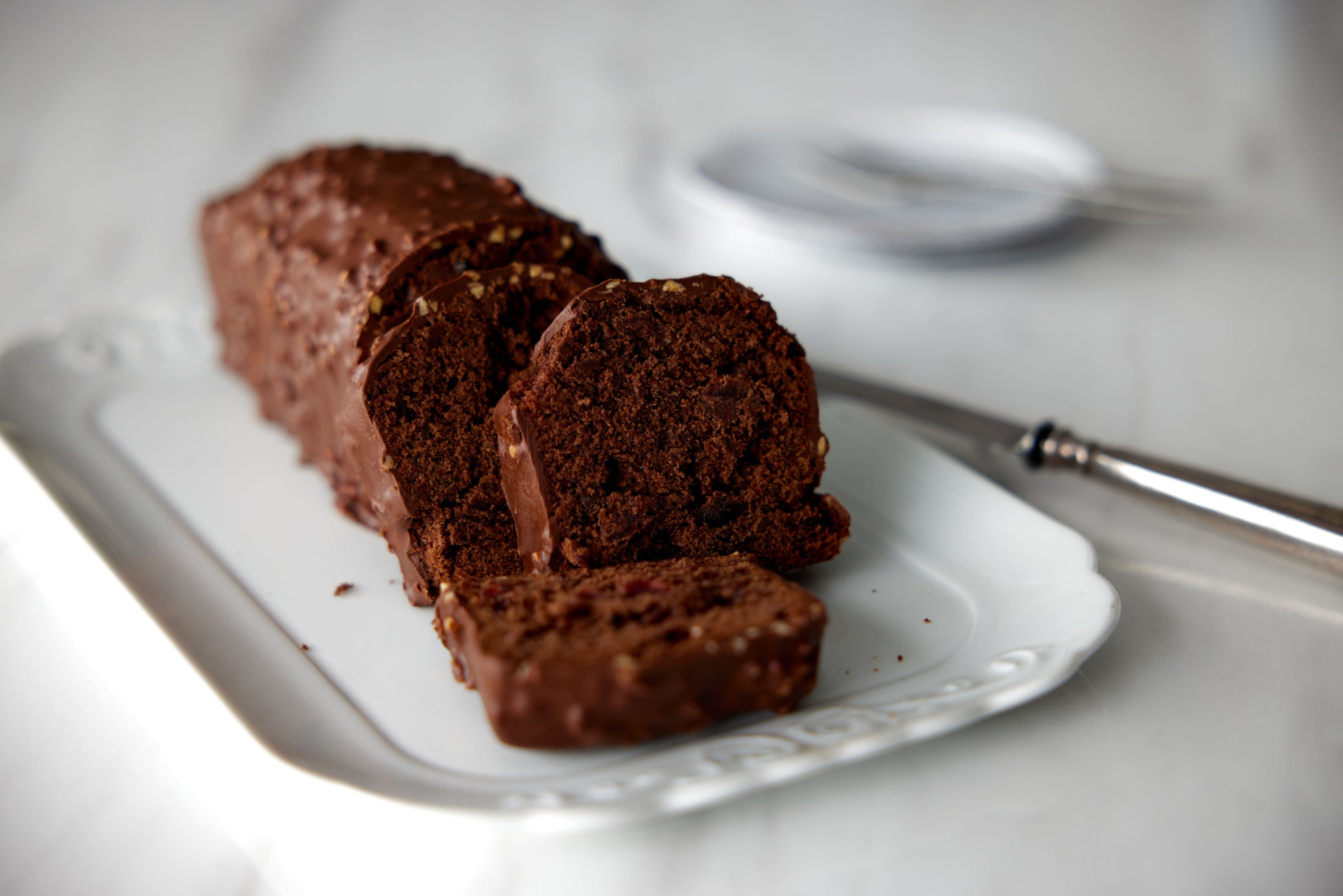 くちどけのよいココア生地に、クランベリー・ストロベリーのドライフルーツをキルシュに漬けた自家製フルーツミックスを混ぜ込み、アーモンド入りのチョコレートを全面にかけた贅沢なパウンドケーキ。