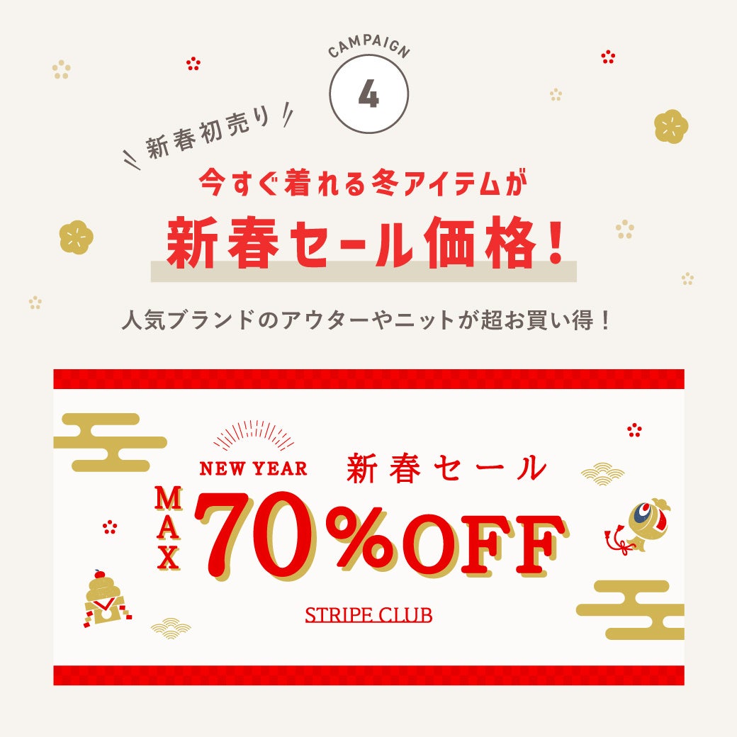 「STRIPE CLUB」では、日頃ご愛顧いただいているお客様へ感謝を込めて、『初夢キャンペーン』を4日間限定で開催。期間中、「STRIPE CLUB」内にて税込み¥7,500以上のお買い上げで豪華体験やプレゼントが当たるキャンペーンやお買い物時に使えるお得なクーポン付きのおみくじ、さらに新春セールの実施など、様々なコンテンツをご用意しております。