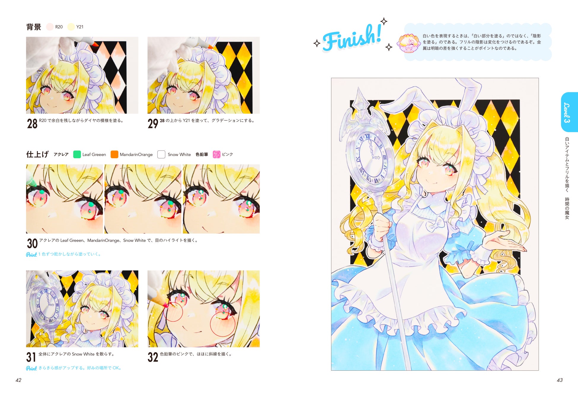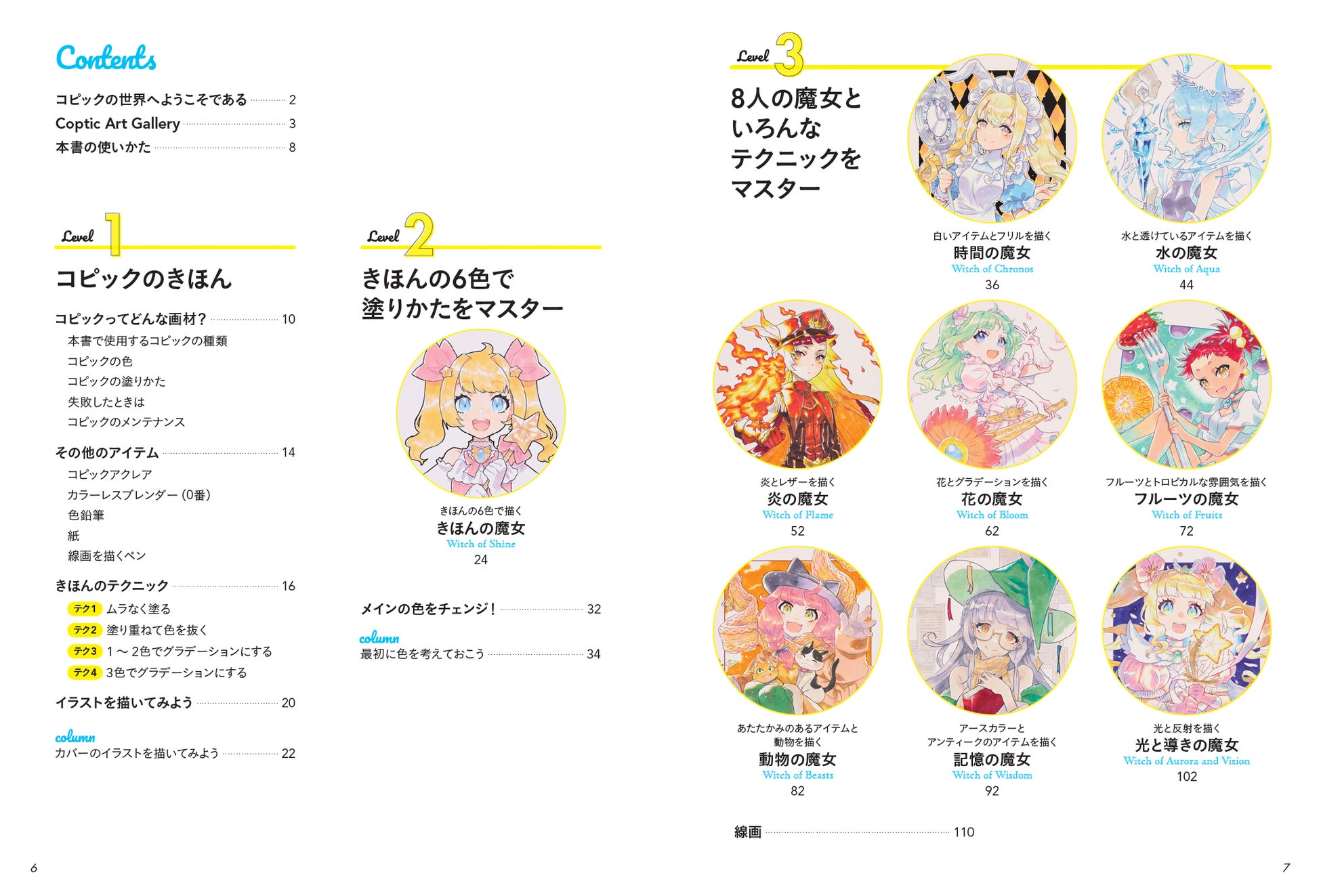 好きなキャラを塗りながら、魔法属性ごとに、目や髪といった人体パーツ、炎や星の輝きなどのエフェクト、クリスタルやファー、金属のような素材の質感までコピックをマスターするなら知っておきたいあらゆる表現を身につけられます。