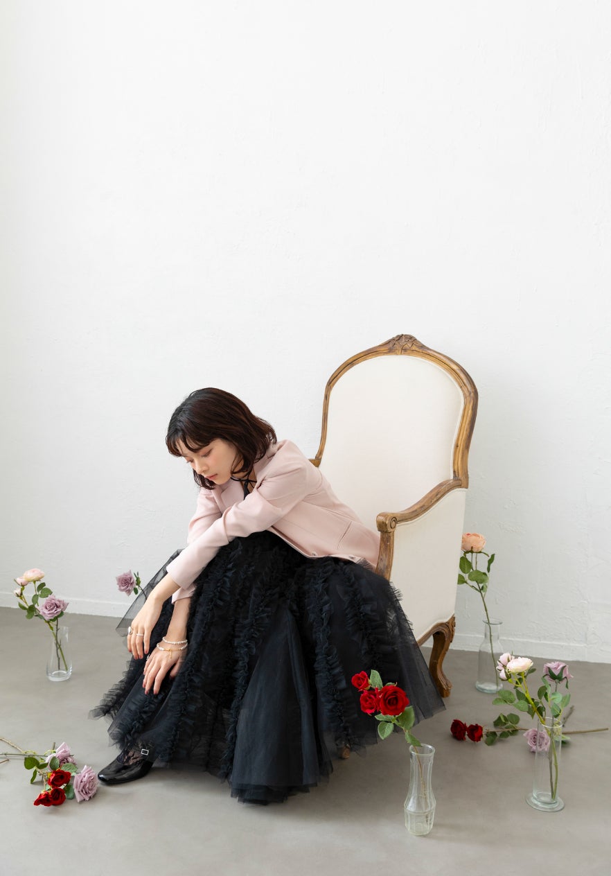 フィットフレアの上品なシルエットのアンダードレスに、チュールのフリルをふんだんにあしらったブラックのボリュームスカート。