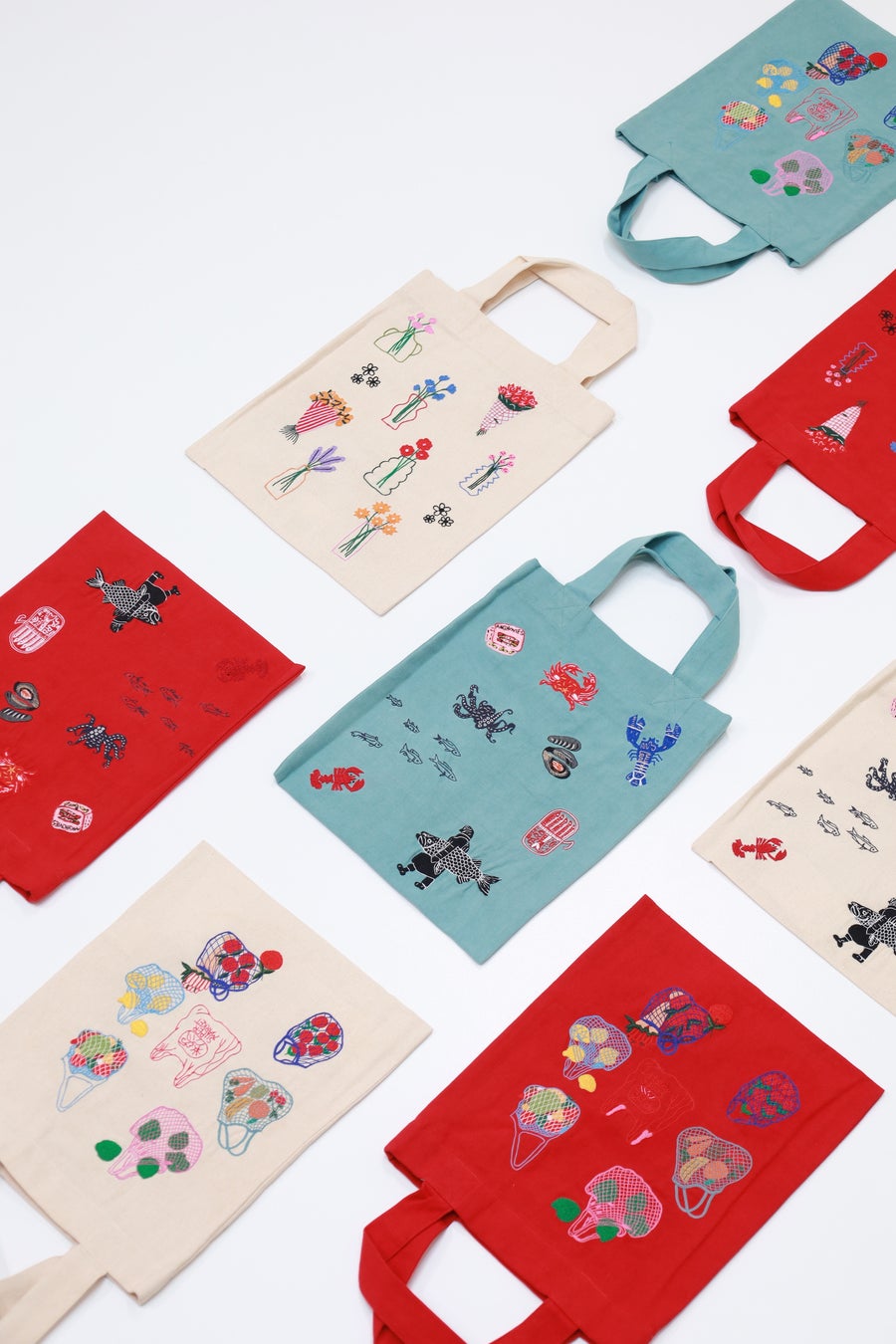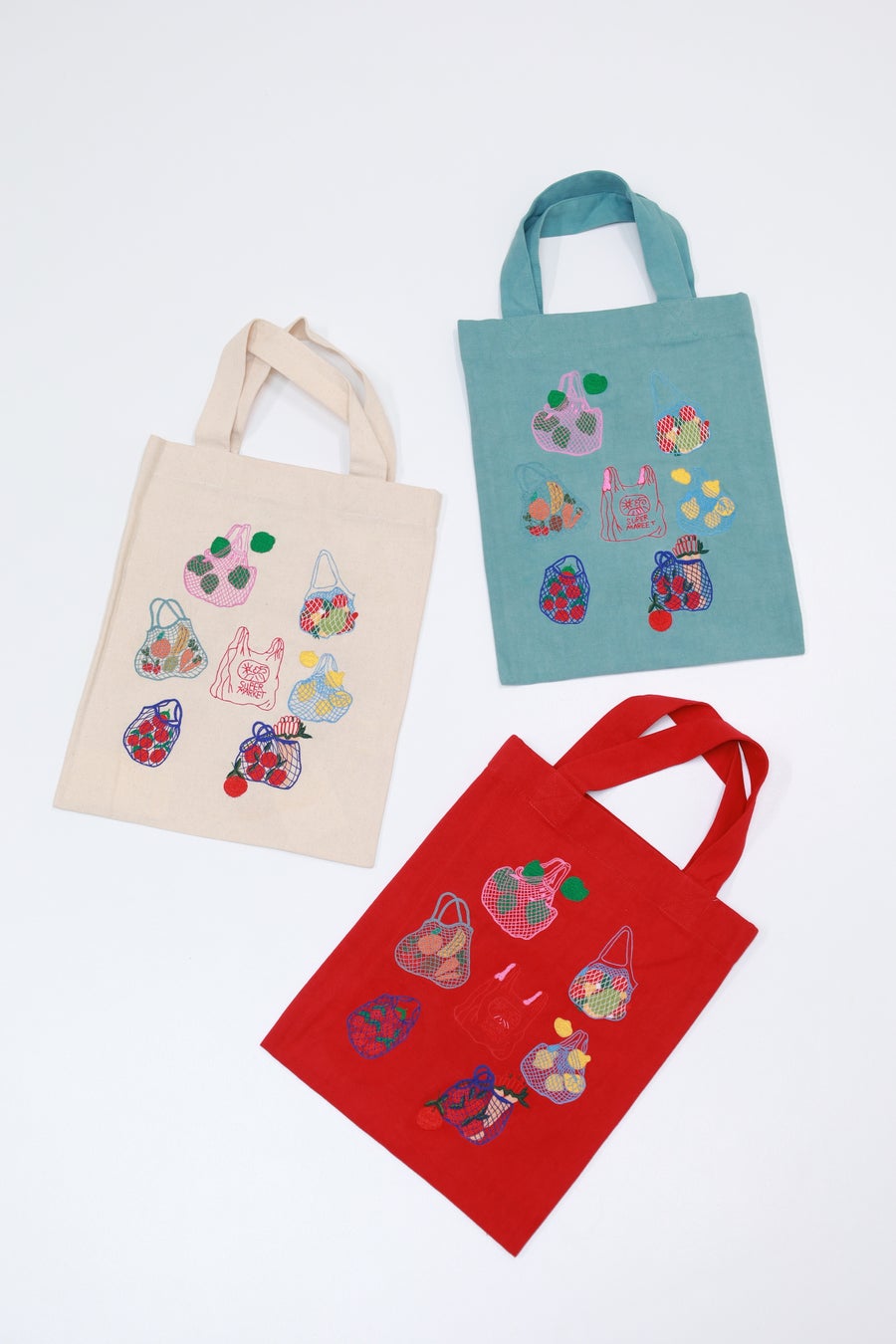 ユーモアのある刺繍やデザインが唯一無二のオランダ発のブランド〈TRIBU-TO〉。オリジナル刺繍が施されたコットン素材のトートバッグをスペシャルオーダー。 SUPER A MARKET のストアコンセプトにちなんで、まるでスーパーマーケットのように フルーツやフラワーマーケットのモチーフがデザインされています。 インド・デリーのアトリエにて、熟練した職人の手によって一点一点丁寧に仕上げられ、 個性が光るデザインの中にクラフツマンシップが感じられるアイテムです。