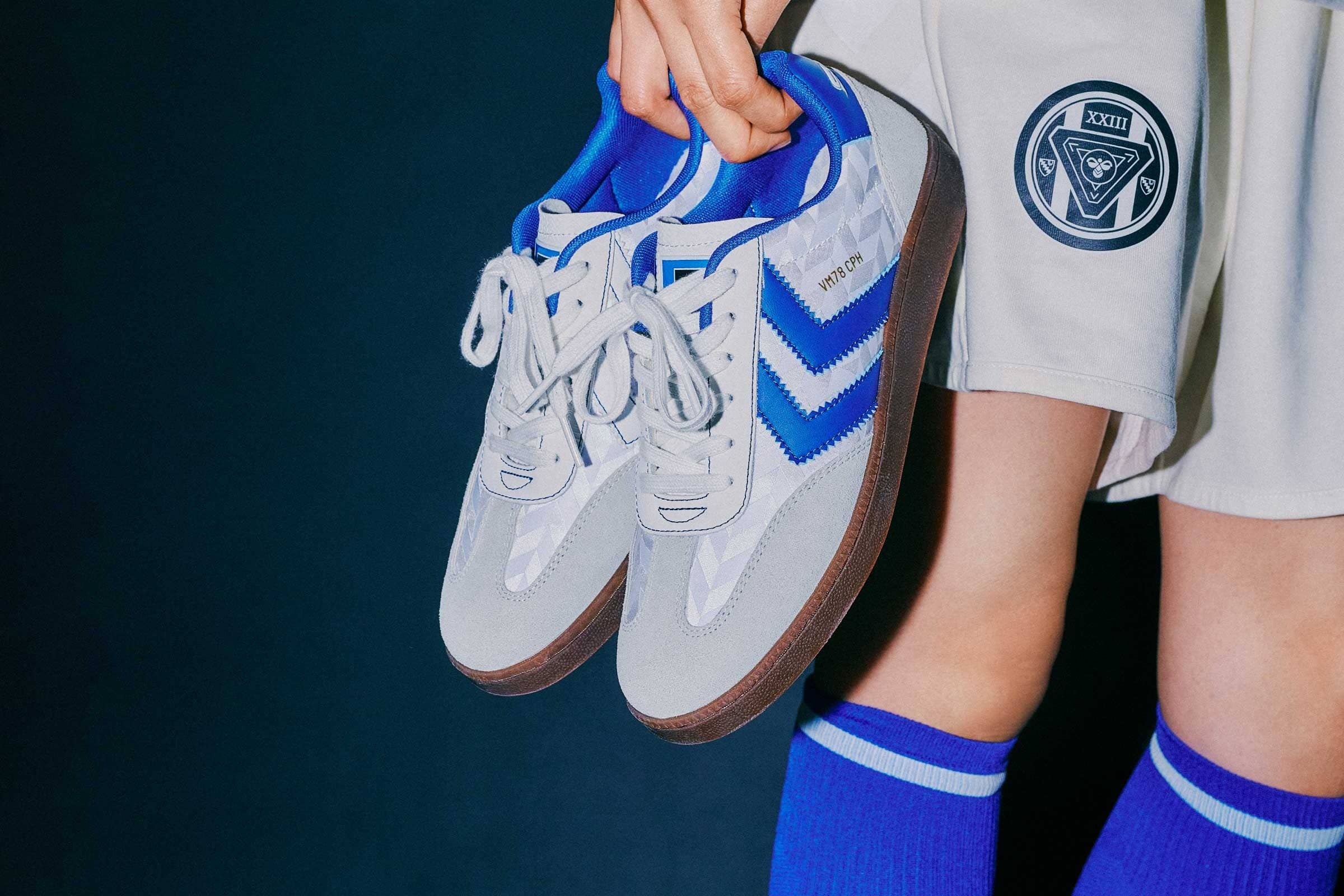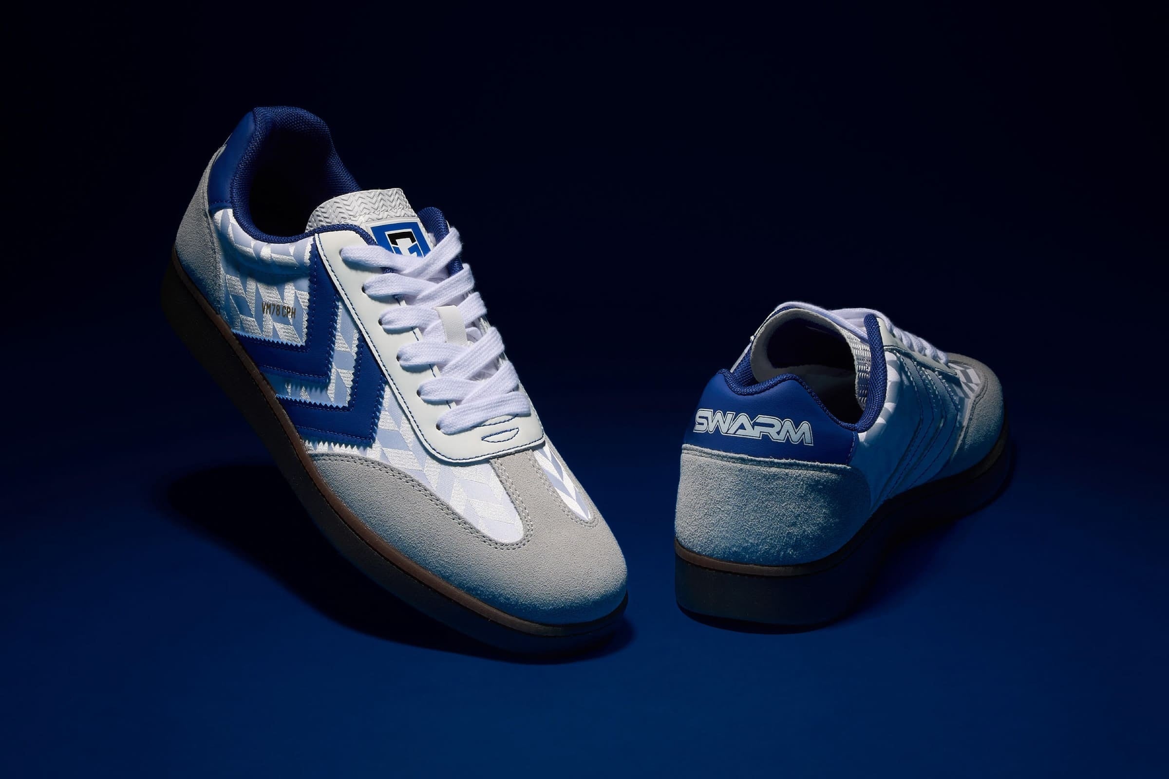 70年代のハンドボールシューズのアーカイブモデル「VM78」をベースにした、クラシックでモダンな1足。アッパーはシェブロンラインの格子柄をホワイトの濃淡で表現し、その上にインサイドはホワイト、アウトサイドはブルーと異なるカラーのシェブロンラインを配置。シュータンにはガンバ大阪のエンブレムをレイアウト。