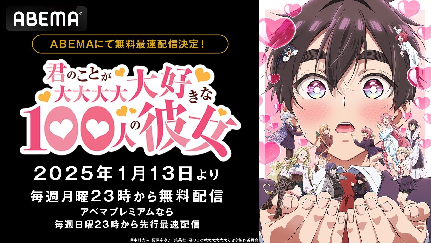このたび、『君のことが大大大大大好きな100人の彼女』第2期の先行最速配信が決定いたしました。2025年1月12日(日)から毎週日曜日夜11時より、「ABEMAプレミアム」&「広告つきABEMAプレミアム」(※1)にて最新話の先行最速配信を開始。また翌13日(月)から毎週月曜日夜11時より、「ABEMAアニメチャンネル」にて最新話を無料最速配信するほか、放送後1週間、最新話を無料でお楽しみいただけます。
