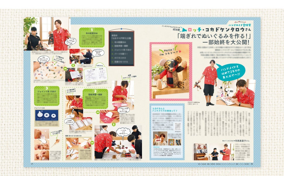 インスタで披露するハンドメイドが話題のロッチ・コカドさんが、連載スタートに先駆けて「ぬいぐるみ作り」に初挑戦した全容をリポート取材! ユニークで楽しい語りとともにでき上がっていく「コカドベア」は、作り方も掲載。今号から、コカドさんと一緒にハンドメイドを楽しみましょう!